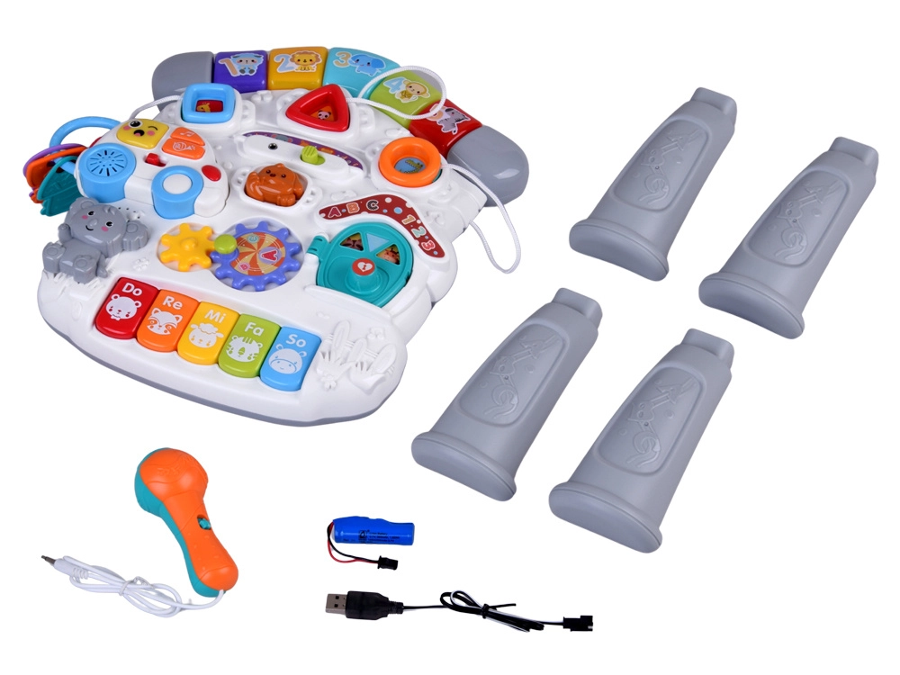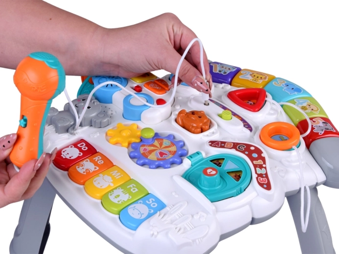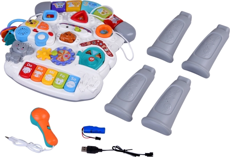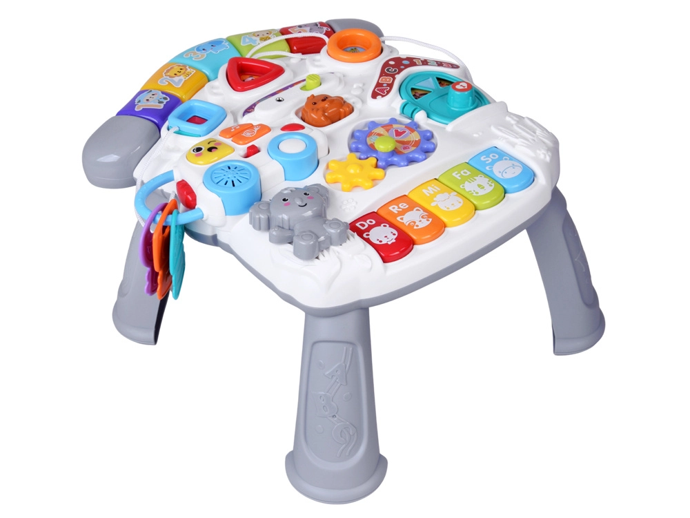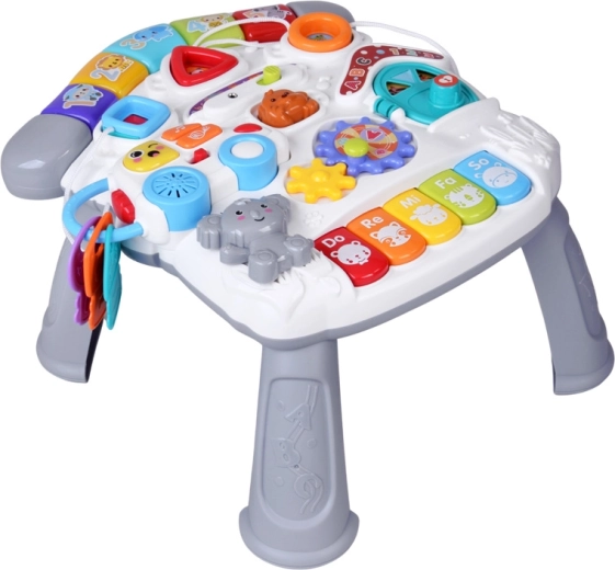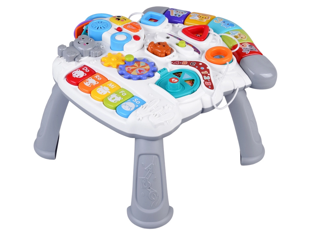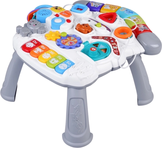 De kleurrijke interactieve tafel voor de allerkleinsten is een klein centrum vol ontdekking en muziek. Hij biedt lichteffecten, melodieën, een mini-piano Do-Re-Mi, draaibare tandwielen, vorm- en dierenknoppen, een afneembaar autootje met sleutels en een microfoon. Ontwikkelt de fijne motoriek, oog-handcoördinatie, leert kleuren, vormen en geluiden en stimuleert zelfstandig spel.