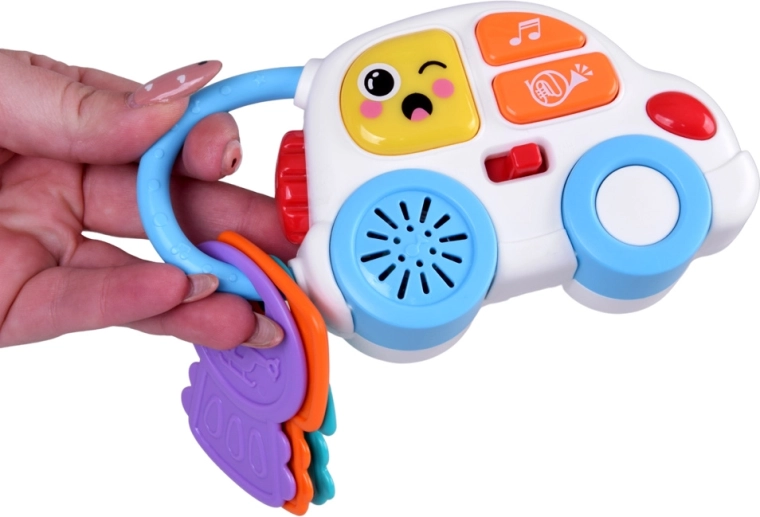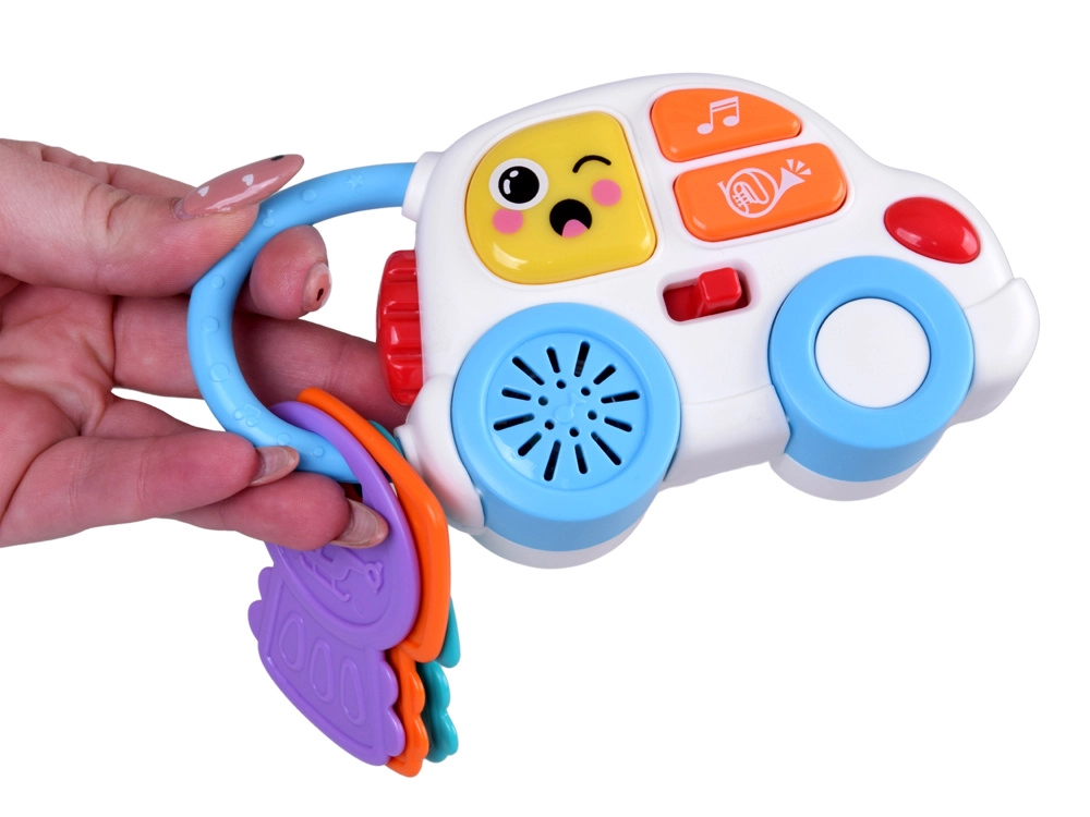 Het kleine autootje met eigen lichtjes en geluiden kan worden verwijderd en los gebruikt. Getextureerde sleutels liggen fijn in kleine handjes en nodigen uit om vast te pakken.