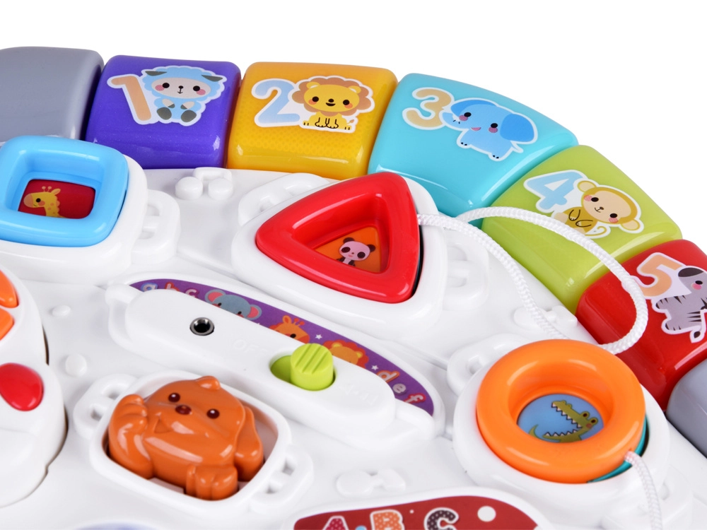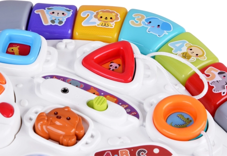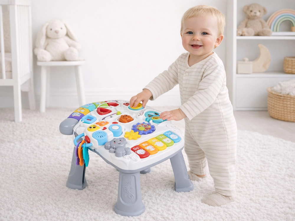 De interactieve tafel verandert elk speelmoment in een avontuur. Door op knoppen te drukken start het kind vrolijke melodieën, lichtjes en dierengeluiden, draait het aan tandwielen, schuift het elementen en ontdekt verrassingen verborgen onder vormen. Stabiele poten en een duurzame uitvoering zorgen voor veilig gebruik en een lange levensduur.
