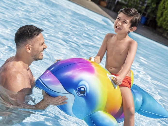 De BESTWAY rijdende dolfijn is een ideale keuze voor waterpret van kinderen. Dankzij de twee robuuste handgrepen is opstappen en vasthouden tijdens het bewegen eenvoudig en veilig, terwijl de twee onafhankelijke luchtkamers de stabiliteit op het wateroppervlak vergroten. Het hoogwaardige PVC-materiaal weerstaat dagelijks gebruik en draagt bij aan een lange levensduur.