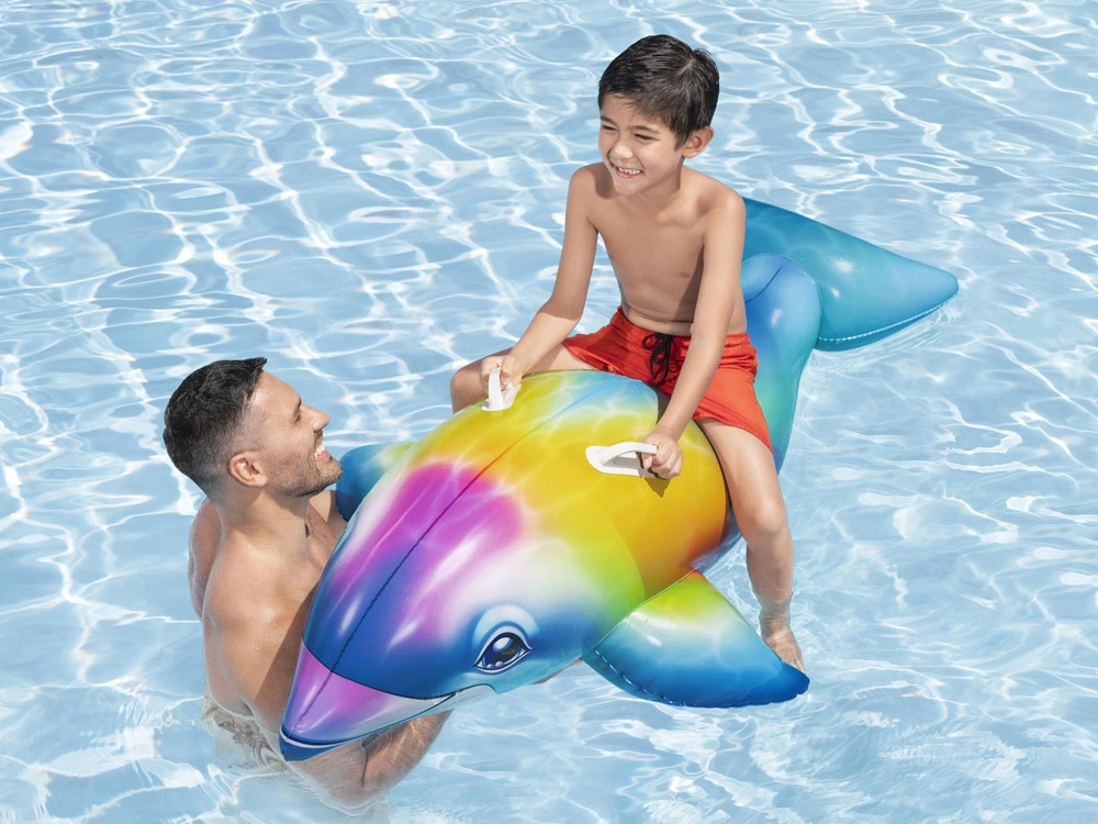 De multicolor uitvoering in dolfijnvorm spreekt kinderen aan en stimuleert actief spelen in het water. De float is geschikt voor zwembaden, meren en rustig zeewater en is dankzij de lichte constructie gemakkelijk te dragen en op te bergen. Snel opblazen en leeg laten lopen is handig bij elk uitstapje naar het water.