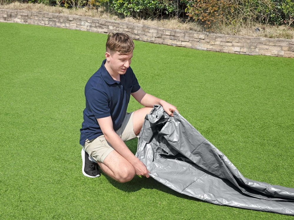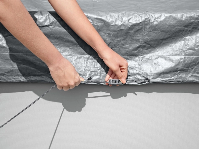 Slimme afvoergaten laten regenwater weglopen, waardoor er geen plassen op het zeil ontstaan. Het windbestendige klemsysteem en het aantrekkoord zorgen voor een stevige afsluiting rondom, zodat het zeil ook bij slechtere weersomstandigheden blijft zitten.