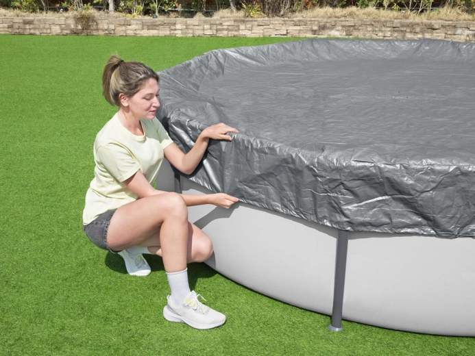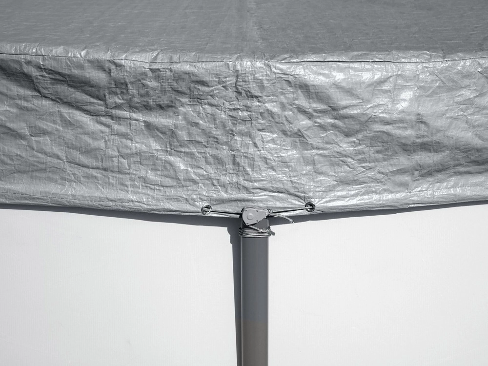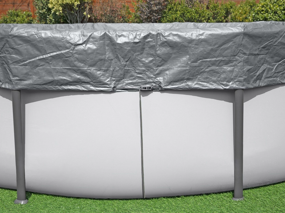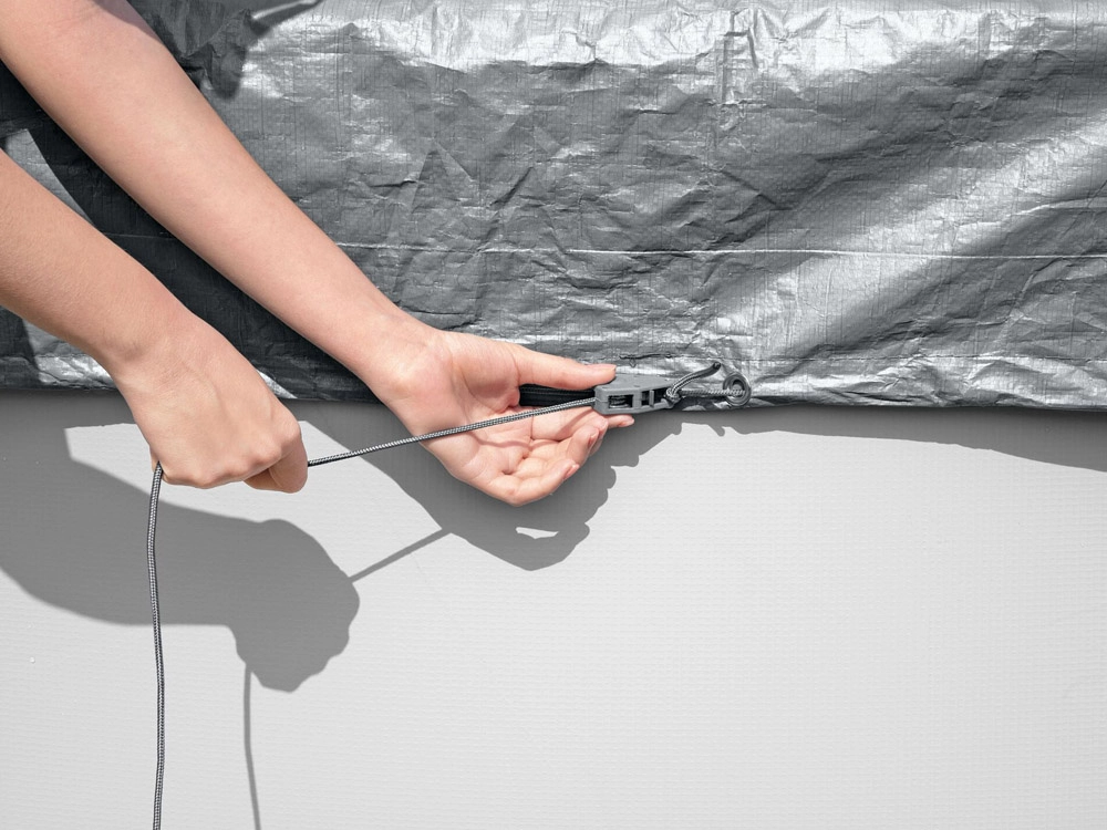 Het klemsysteem en het aantrekkoord houden het zeil stevig op zijn plaats en verbeteren de aansluiting rondom de zwembadrand.