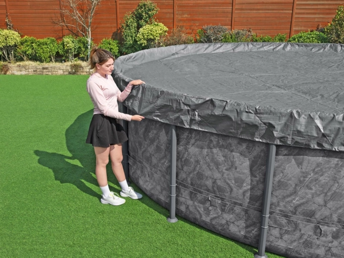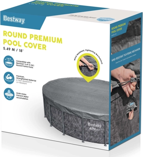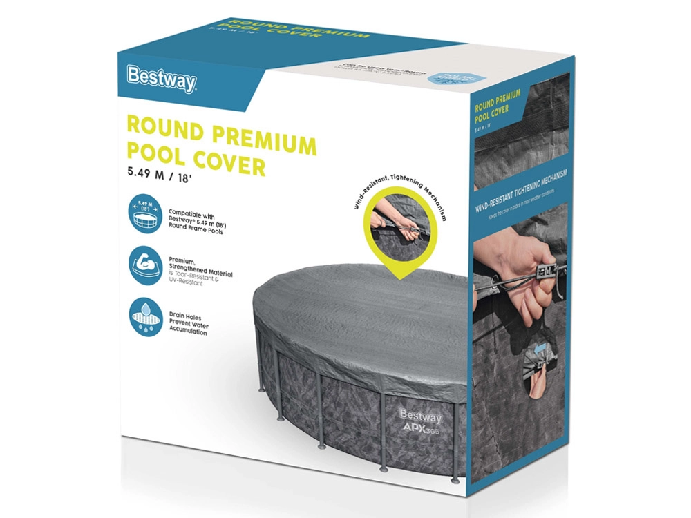 Het hoogwaardige BESTWAY afdekzeil voor ronde zwembaden met een diameter van 5,49 m is ontworpen voor gebruik gedurende alle seizoenen. Het versterkte materiaal met UV‑bescherming is bestand tegen scheuren en weersinvloeden, terwijl de Polar‑Shield oppervlaktebehandeling helpt de eigenschappen ook bij lage temperaturen te behouden.
