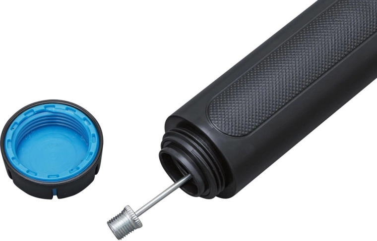In de verpakking zitten 3 ballennaalden, 2 adapters voor verschillende ventielen, een flexibele slang en een manometer voor drukcontrole in het bereik van 0–12 psi. Per slag levert hij een volume van 0,055 l, wat zorgt voor snel en efficiënt oppompen zonder elektriciteit.