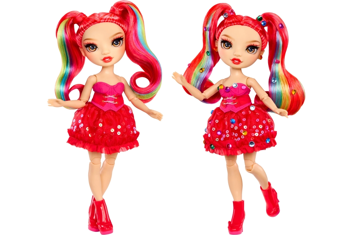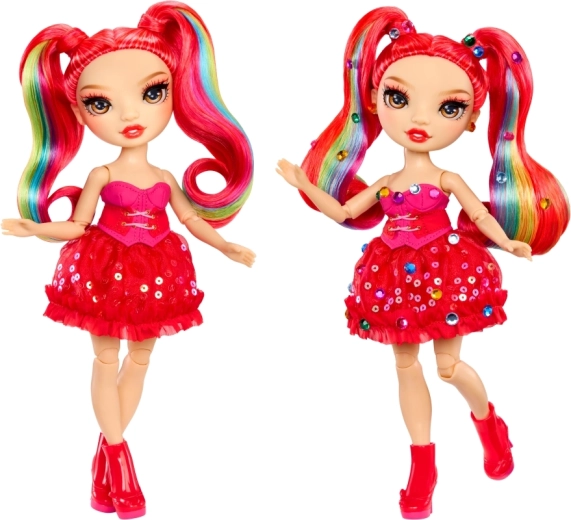 Glitterende rode jurk, matchende schoenen en regenbooglokjes in het haar zorgen voor een onmiskenbare fashionstijl.
