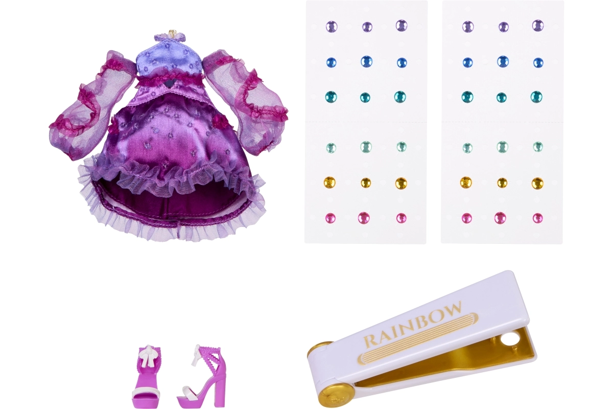 - 1 pop met bewegende gewrichten, 1 outfit, regenboogsteentjes, RAINBOW krimptang