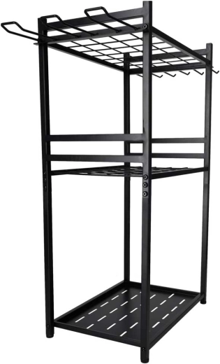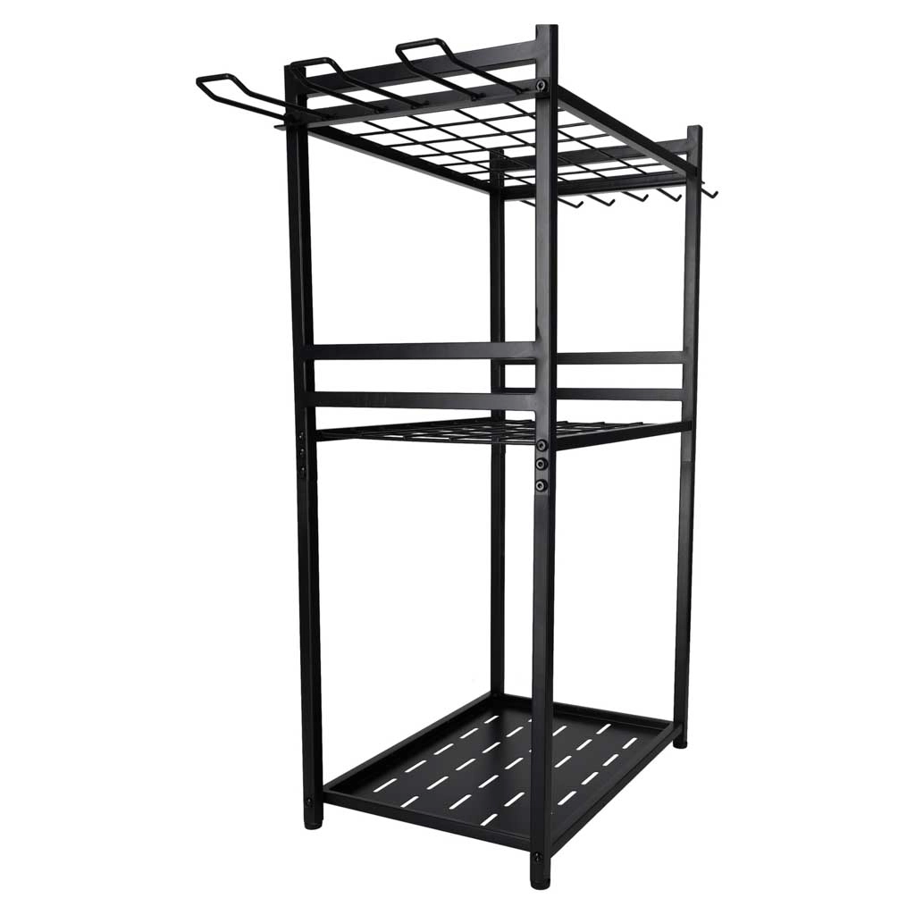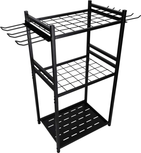 Onderste geperforeerde plank voor stabiliteit, middelste en bovenste roosters voor overzichtelijke opslag van gereedschap en accessoires.