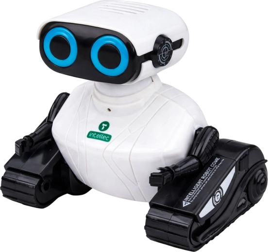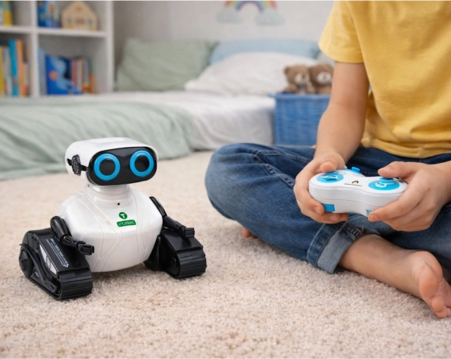 Ontdek een slimme speelkameraad die technologie en plezier combineert. Deze interactieve robot met rupsbandonderstel rijdt moeiteloos over vloer, laminaat en tapijt. Met de overzichtelijke controller bepaalt je kind eenvoudig de richting en start muziek, geluidseffecten en de dansmodus. Felblauwe LED-ogen geven hem een futuristische look en vergroten het speelplezier.
