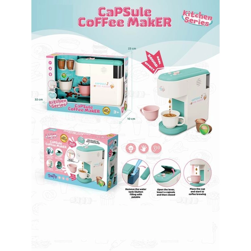 Ontdek de wereld van het café direct in de kinderkamer. Dit kinder-koffiezetapparaat zorgt voor realistisch spel, waarbij kinderen hun favoriete “koffie” kunnen “zetten”, familie en vriendjes kunnen bedienen en hun fantasie ontwikkelen. Dankzij de compacte afmetingen is het eenvoudig op te bergen en mee te nemen.