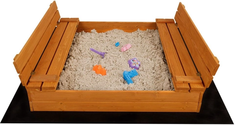 Twee tegenover elkaar liggende bankjes klap je na het spelen eenvoudig neer, zodat de hele zandbak wordt afgesloten. Het zand blijft schoon en beschermd tegen dieren en vuil.