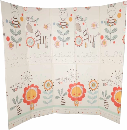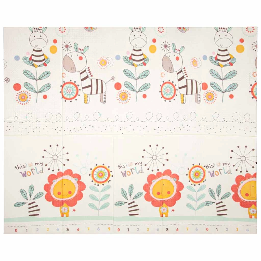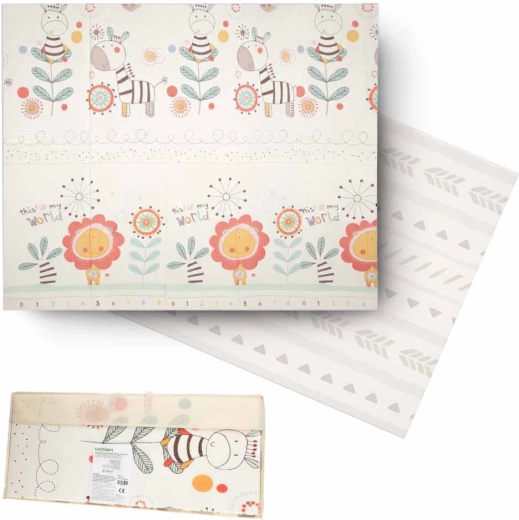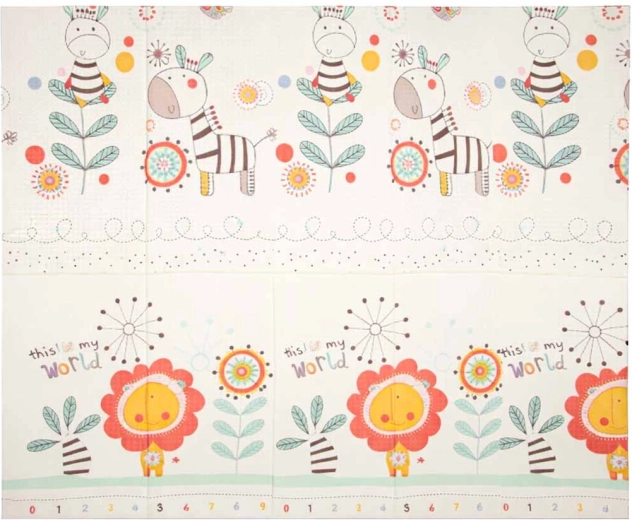 Praktische, veilige en stijlvolle foam speelmat voor kinderen met afmetingen van 180 × 200 cm, met een dubbelzijdig design met dierenmotieven, een opvouwbare constructie en een antislipstructuur voor comfortabel en veilig spelen. Dankzij het XPE-materiaal is de mat zacht, schokabsorberend, heeft antiallergische eigenschappen en is gemakkelijk schoon te maken.