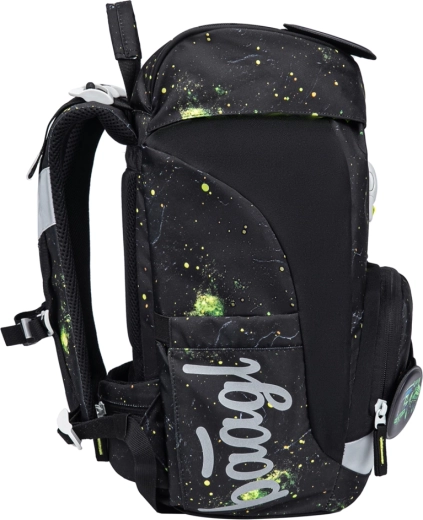 De interne eenkamerindeling met vak en elastiek voor het vastzetten van mappen helpt orde te houden in schoolspullen. De rugzak en accessoires zijn gemaakt van waterafstotende, GRS-gecertificeerde gerecyclede materialen en aangevuld met reflecterende elementen voor betere zichtbaarheid. Het design met verwisselbare badges (patches) laat kinderen het uiterlijk eenvoudig aanpassen.