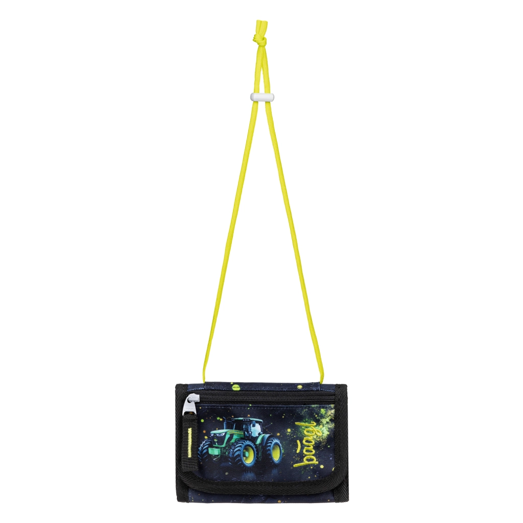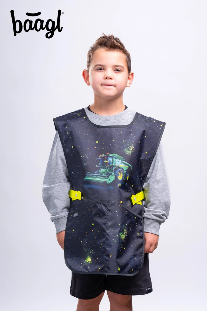 Onderdeel van de set zijn een klassiek etui met één laag en twee binnenflappen (zonder vulling) met YKK-rits, een praktische gymsack met ritsvak en stevige koorden, een beschermend schort voor beeldende vorming en handvaardigheid, en een compacte halsportemonnee. Alles in een aantrekkelijk “tractor”-motief met neonaccenten voor maximaal plezier op elke schooldag.