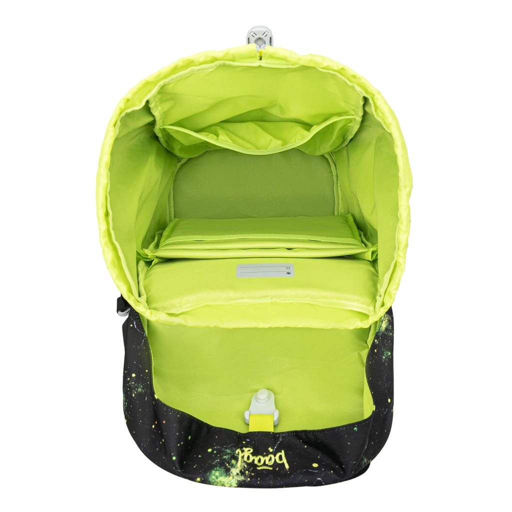 Eenvoudige sluiting die elke leerling moeiteloos bedient. Eenkamerindeling met vak en elastiek houdt mappen en schriften veilig op hun plek, buitenvakken bieden ruimte voor een fles en kleine spullen.