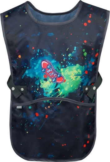 Binnenin vind je een hoofdvak met organizer en lichte kunststof platen ter bescherming van schriften, en aan de voorkant een thermovak voor tussendoortjes. De set omvat een eenlaags etui (zonder inhoud) met YKK-rits, een ruime zak met ritsvak, een praktische nekportemonnee en een schort voor beeldende vorming. De hele set wordt aangevuld met reflecterende elementen voor betere zichtbaarheid en duurzame, waterbestendige gerecyclede materialen met GRS-certificering.