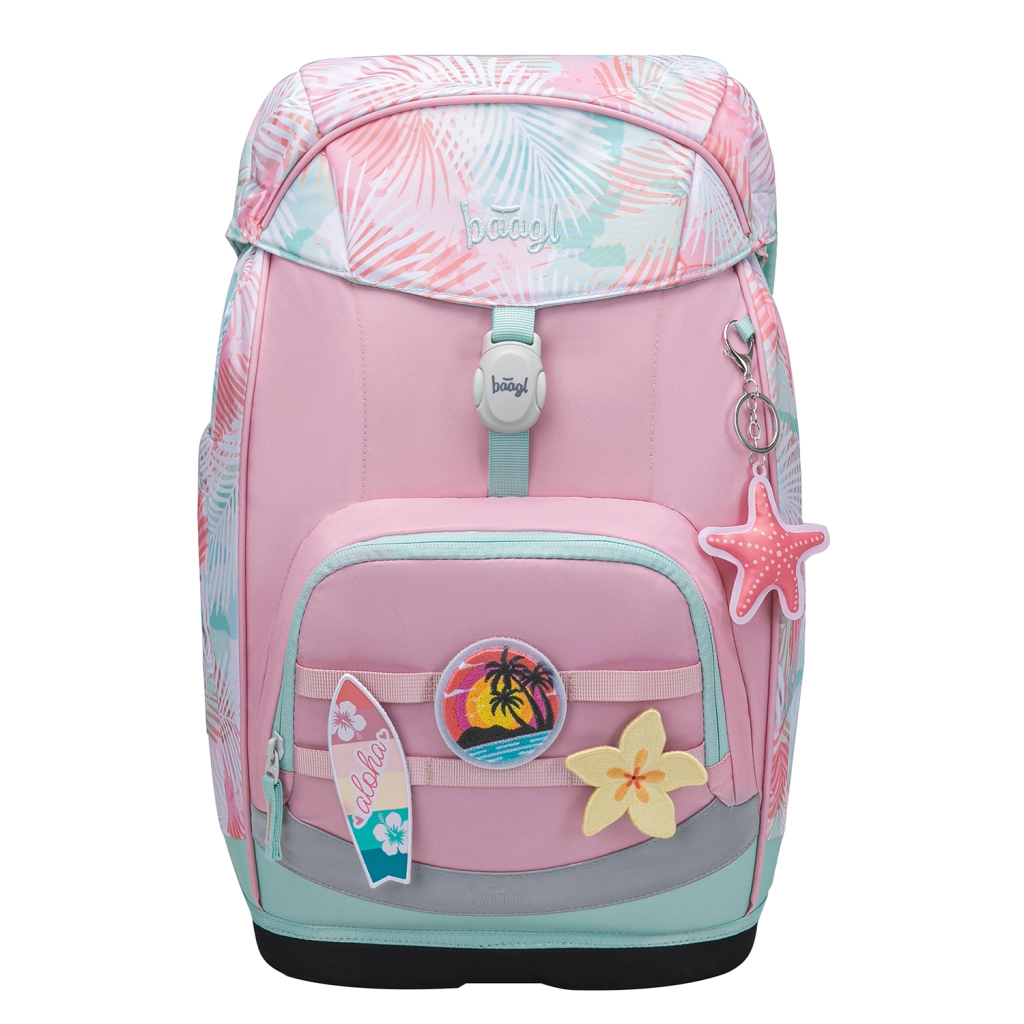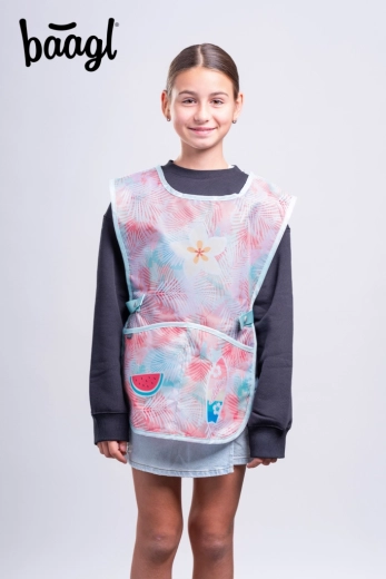 Complete BAAGL Airy Plus Sunset schoolset voor de onderbouw van de basisschool, met een ergonomische rugzak met meegroeisysteem voor de rug, een praktische éénlaagse etui, een lichte zak, een beschermend schort en een portemonnee. De rugzak is gemaakt van gerecycled, waterafstotend materiaal en is voorzien van reflecterende elementen, een thermovak voor de lunch en een magnetische sluiting, waardoor elke schooldag makkelijker wordt.