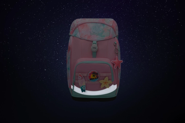 Doordachte organisatie omvat een hoofdvak met organizer, beschermplaten voor schriften, een praktisch deksel met ritsvak en een voorste thermovak voor de lunch. De moderne look wordt aangevuld met verwisselbare badges (Baaglies) en opvallende reflecterende elementen. De éénlaagse etui met YKK-rits kan volledig worden opengeklapt, heeft een klein zakje voor kleinigheden, een venster voor het rooster en stevige elastieken ook voor driekantige kleurpotloden (geleverd zonder inhoud). De zak met trekkoorden is ideaal voor gymschoenen of gym, het schort beschermt tijdens handvaardigheid en de portemonnee houdt zakgeld veilig.
