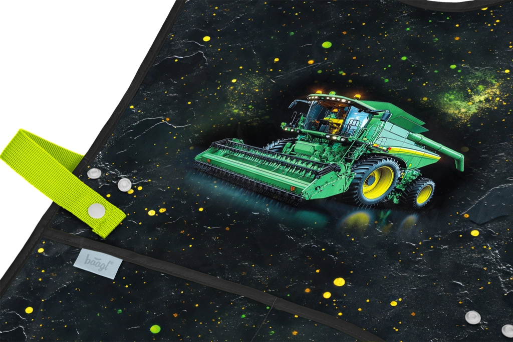 Praktisch kinderkeukenschort van BAAGL met TRACTOR-motief, ideaal voor beeldende vorming, praktische werkzaamheden en vrijetijdsclubs. Biedt een afwasbaar materiaal, twee ruime zakken en een duurzame GRS-certificering voor milieuvriendelijkheid.