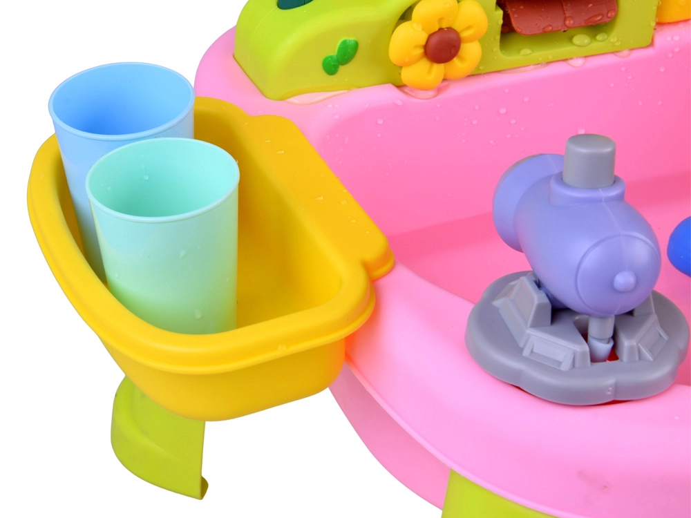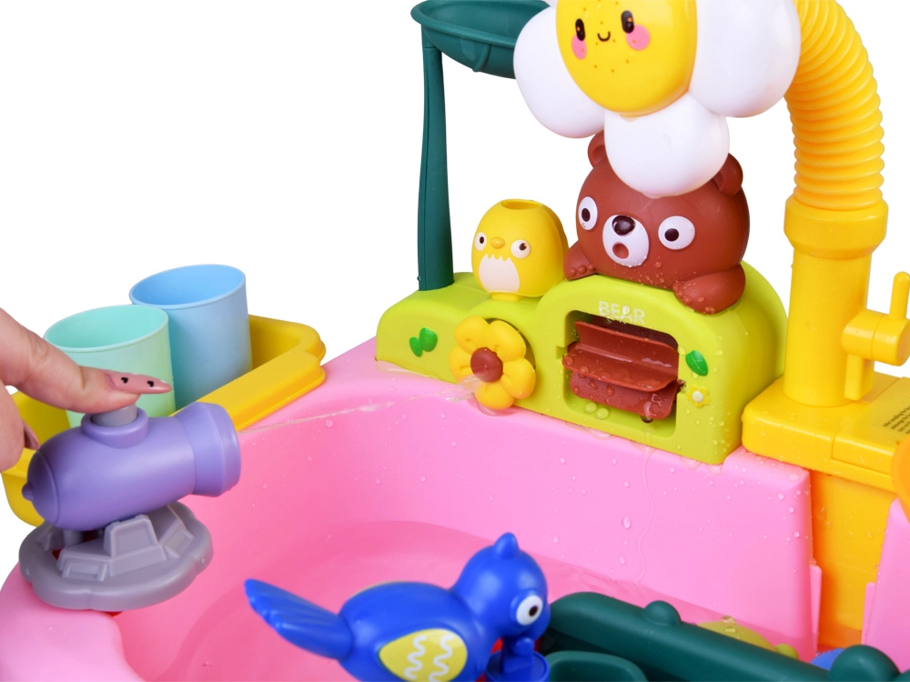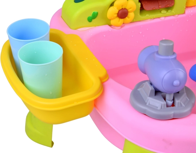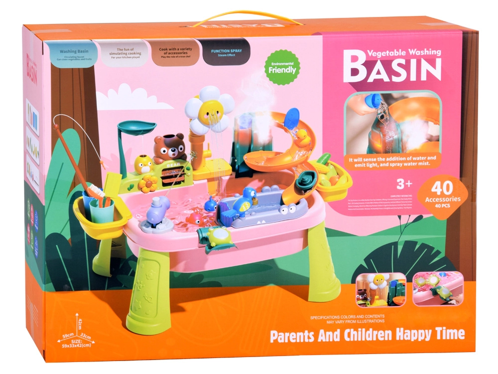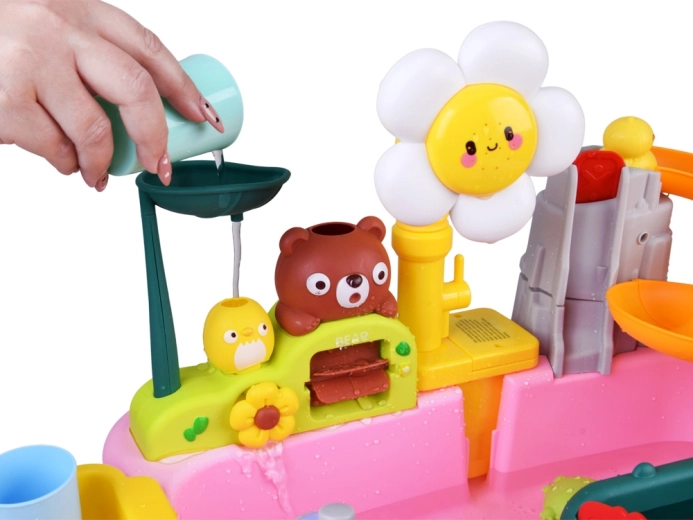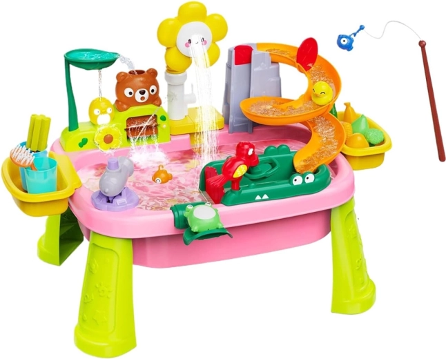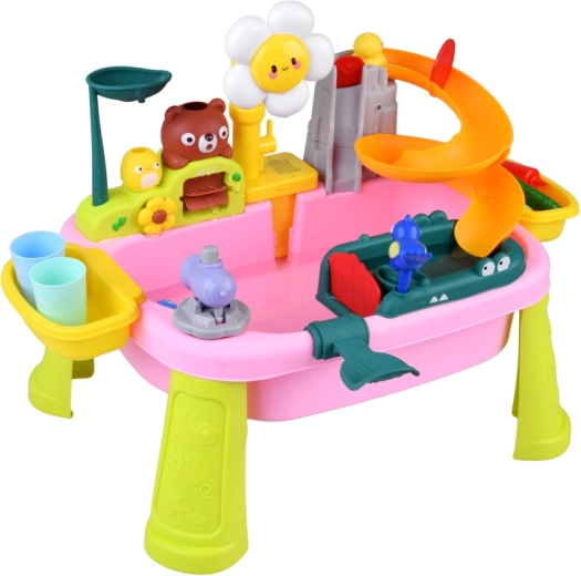 Ontdek het plezier met de kleurrijke watertafel die elke dag in een avontuur verandert. Kinderen genieten van stromend water, een glijbaan, een bloemvormige sproeier, vissen en het wassen van “etenswaren”. De tafel stimuleert creativiteit, fijne motoriek en zintuiglijke waarneming – ideaal voor binnen en buiten.