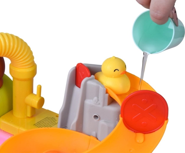 Inclusief een uitgebreide set van ca. 40 stuks: schattige dierfiguurtjes, een bootje, visjes met hengel, bekertjes, “fruit en groente” om te wassen en meer accessoires. Zijdelingse vakjes houden alles binnen handbereik en helpen bij het opruimen.
