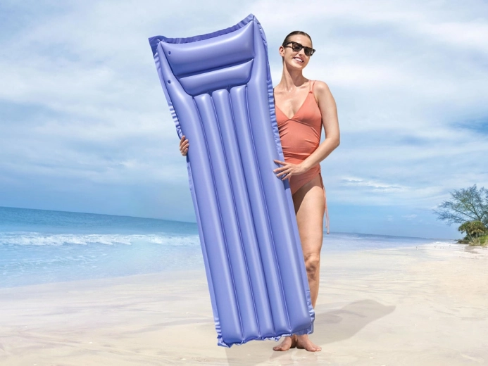 Het opblaasbare luchtbed BESTWAY in paars is een uitstekende keuze voor ontspanning op het water. Het stevige PVC-materiaal zorgt voor een lange levensduur en de gesegmenteerde luchtkamers met geïntegreerd kussen verhogen de stabiliteit en het comfort tijdens het liggen en zonnebaden.