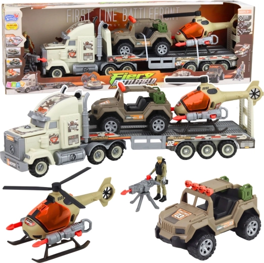- Complete set: trekker met oplegger, helikopter, terreinwagen, soldatenfiguur