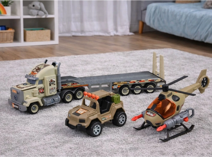 Deze militaire speelgoedset stimuleert fantasie, creativiteit en fijne motoriek. De grote trekker met platte oplegger vervoert veilig zowel de helikopter als de terreinwagen, zodat kinderen verplaatsingen naar een gevechtspost of basis kunnen naspelen. Dankzij de stevige kunststof is de set klaar voor urenlang actief spel.