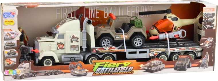 Uitgebreide militaire set voor creatieve spelletjes met een grote transporttrekker met oplegger, helikopter, terreinwagen en een soldatenfiguur. Kinderen kunnen realistische missies en konvooien creëren, materieel verplaatsen en reddingsacties oefenen. De helikopter biedt licht- en geluidseffecten, de voertuigen hebben vrijlopende wielen en een robuuste afwerking in militaire stijl.
