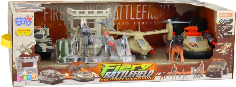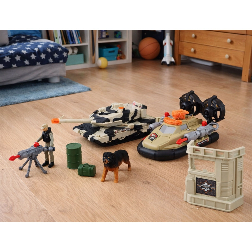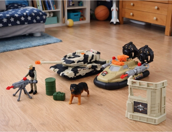Uitgebreide militaire set voor kinderen met een tank met licht- en geluidseffecten, een helikopter met raketlanceerder, een hovercraft, figuren van soldaten, een hond en een militaire basis. Dankzij de draaibare toren van de tank, beweegbare onderdelen en rijk accessoires bouwen kinderen hun eigen missies, patrouilles en gevechten en stimuleren ze fantasie en creatief spel.