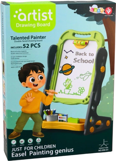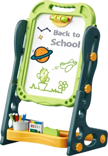 Creatief dubbelzijdig magnetisch bord voor kinderen met een krijtzijde en een whiteboardzijde met magneetfunctie. De stabiele standaard, het gemakkelijk meenemen en het aantrekkelijke groene design ondersteunen leren door spel, schrijven, tekenen en het plaatsen van magneten. De uitgebreide set van 52 stuks biedt veel plezier en educatie.