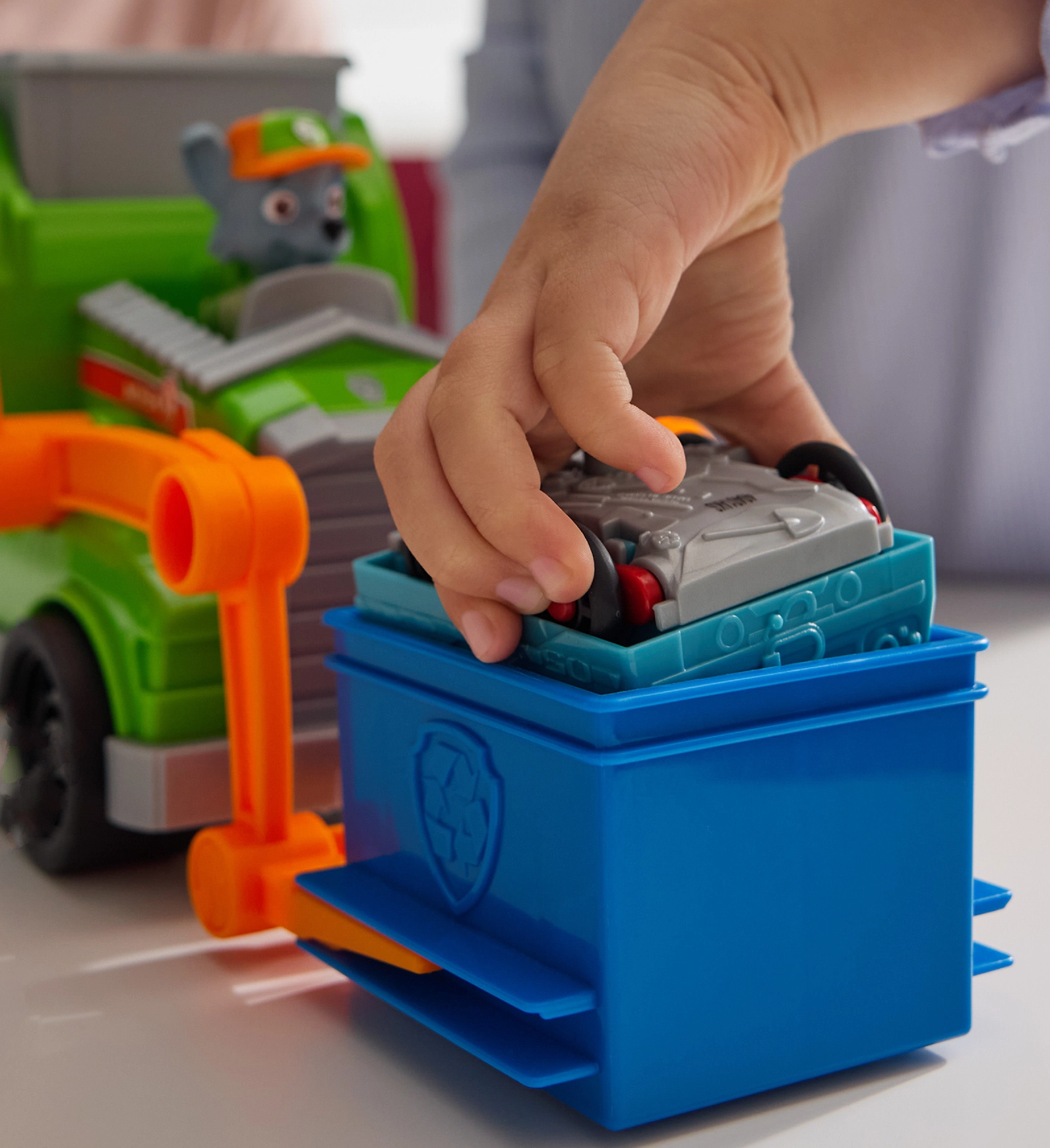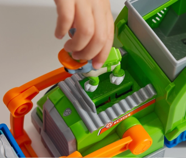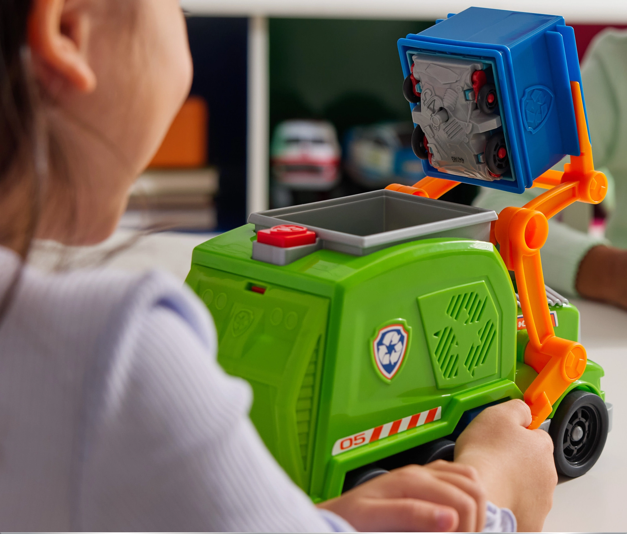 De populaire held Rocky staat klaar om kinderen te leren recyclen en slim afval om te toveren tot nuttige dingen. De recyclewagen Crush ’N’ Roll biedt realistische onderdelen – een vuilnisbak, een transportkarretje en een hendel die het vermalen en omvormen van een verfrommeld voertuig tot een miniautootje start. Kinderen kunnen Rocky in de cabine zetten en nieuwe missies beleven zoals in de serie PAW PATROL.