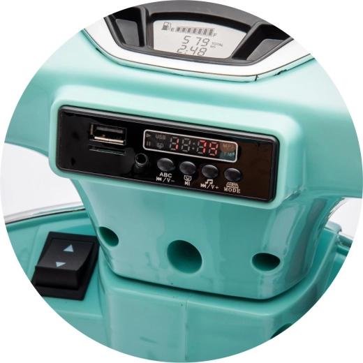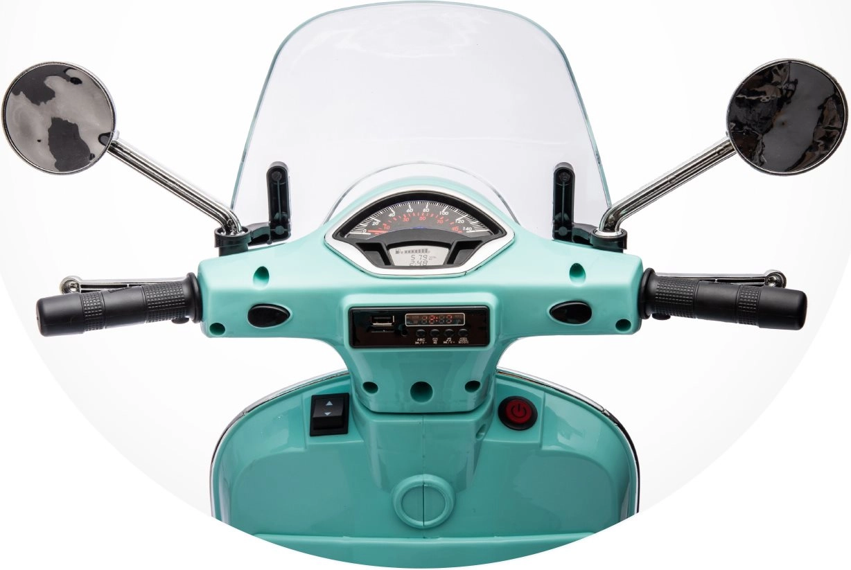 Stijlvolle elektrische kindermotor geïnspireerd op de iconische VESPA GTS, die jonge rijders blij maakt met een realistische look en veilig rijgedrag. Voorzien van twee motoren 2 × 30 W, zijwieltjes, LED-verlichting, een comfortabel zadel van eco-leer en een muziekpaneel met USB/TF/MP3/AUX. Inclusief een achteropbergbox en licht- en geluidseffecten voor extra plezier.
