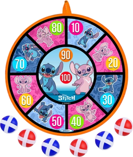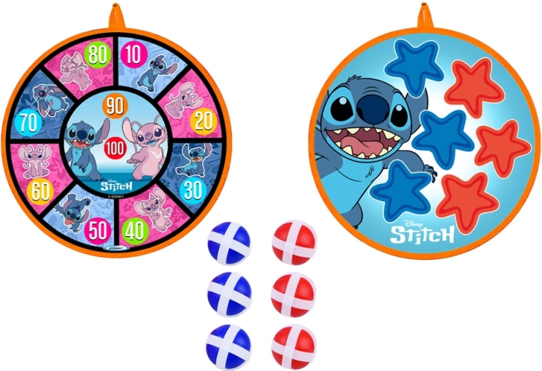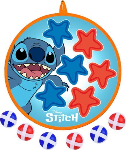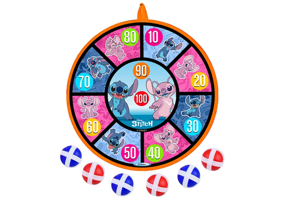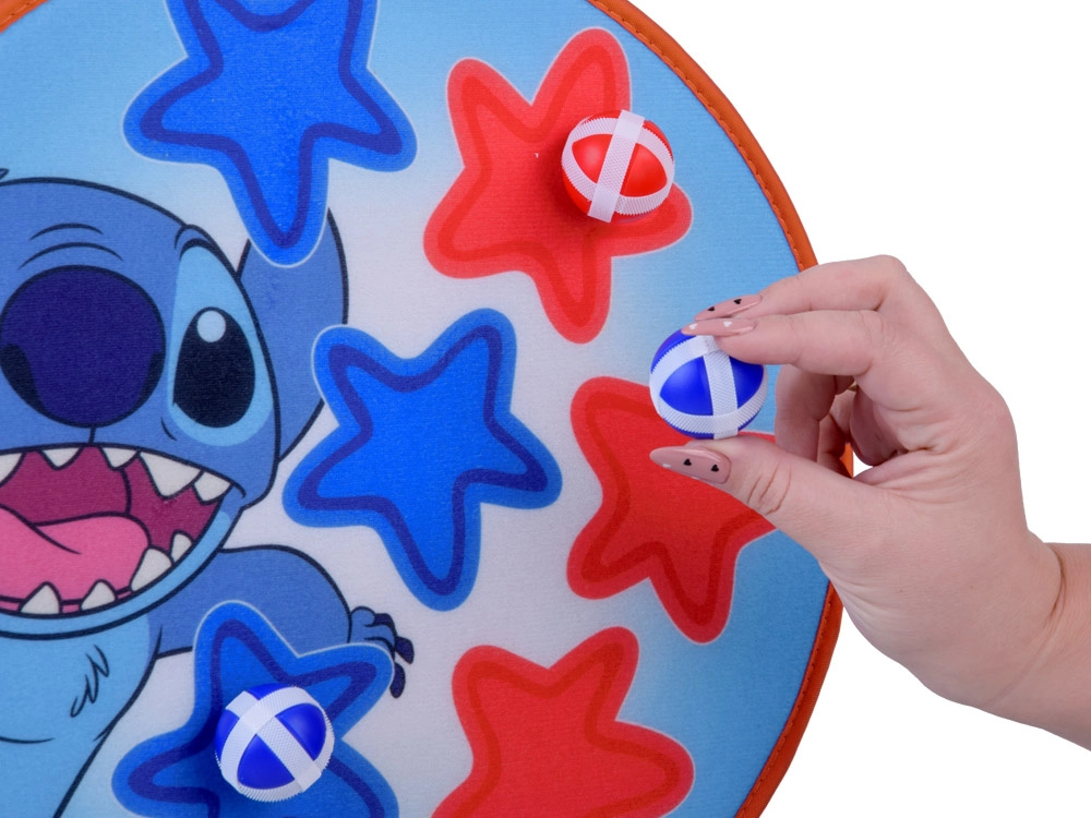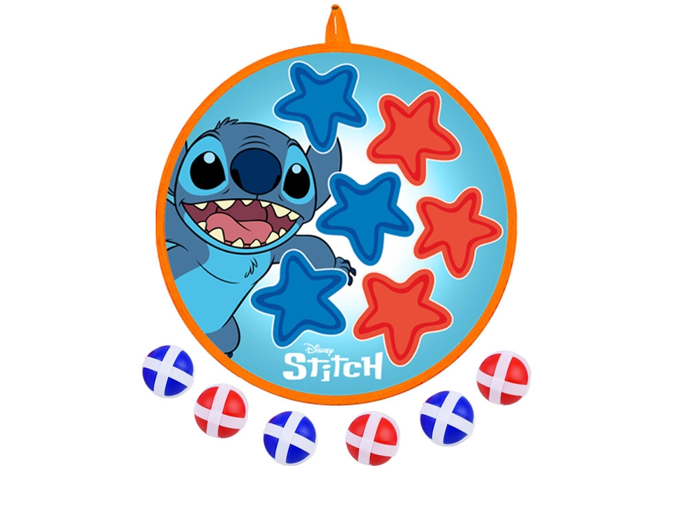 Leuk en veilig spel voor kinderen met STITCH-thema: een dubbelzijdig klittenband-dartsbord met een diameter van 36 cm en 6 lichte ballen (4 cm). Stimuleert oog-handcoördinatie, nauwkeurigheid en actieve beweging binnen en buiten. De zachte ballen hechten gemakkelijk aan het oppervlak en het bord kan aan de muur, deur of in de tuin worden opgehangen.