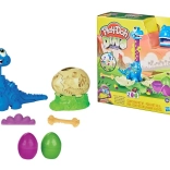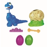 Help de kleine Bronto uit het ei te komen en kijk hoe zijn nek groeit! Vul gewoon de PLAY-DOH-figuur en druk op de staart – de nek schuift uit en het plezier kan beginnen. Met de vormpjes op de figuur en het ei maak je bladeren, bloemen, botten en een stijlvolle strik.