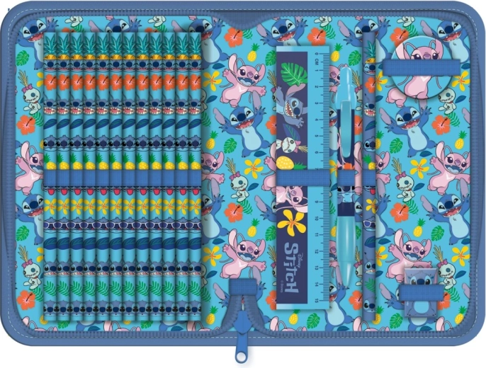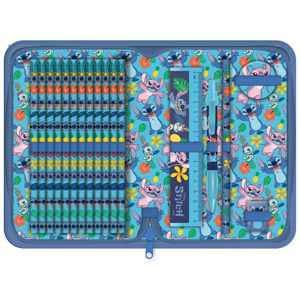 Deze gevulde etui met het schattige motief van Stitch uit de film Lilo & Stitch valt op door het opvallende blauwe design en tropische elementen zoals bloemen en bladeren. De voorkant is versierd met de iconische Stitch, binnenin vind je een speelse print met personages en kleurrijke motieven die de etui een vrolijk karakter geven.