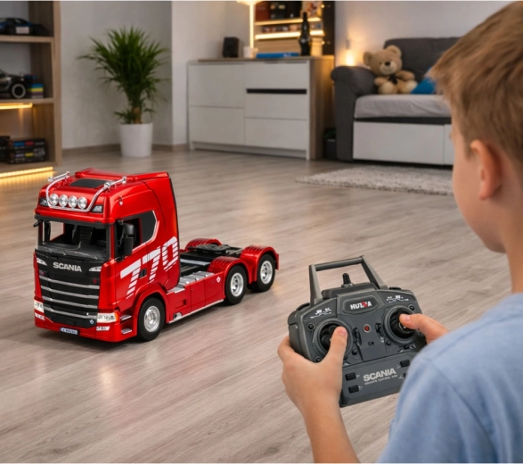 Realistisch model van de SCANIA-trekker met afstandsbediening van het merk Huina in schaal 1:18, met gedetailleerde afwerking, licht- en geluidseffecten en een duurzame constructie van hoogwaardige kunststof. Met een bereik tot 25 m, een accu van 7,4 V 1200 mAh en een rijtijd van circa 15 minuten is hij ideaal voor plezier binnen en buiten.