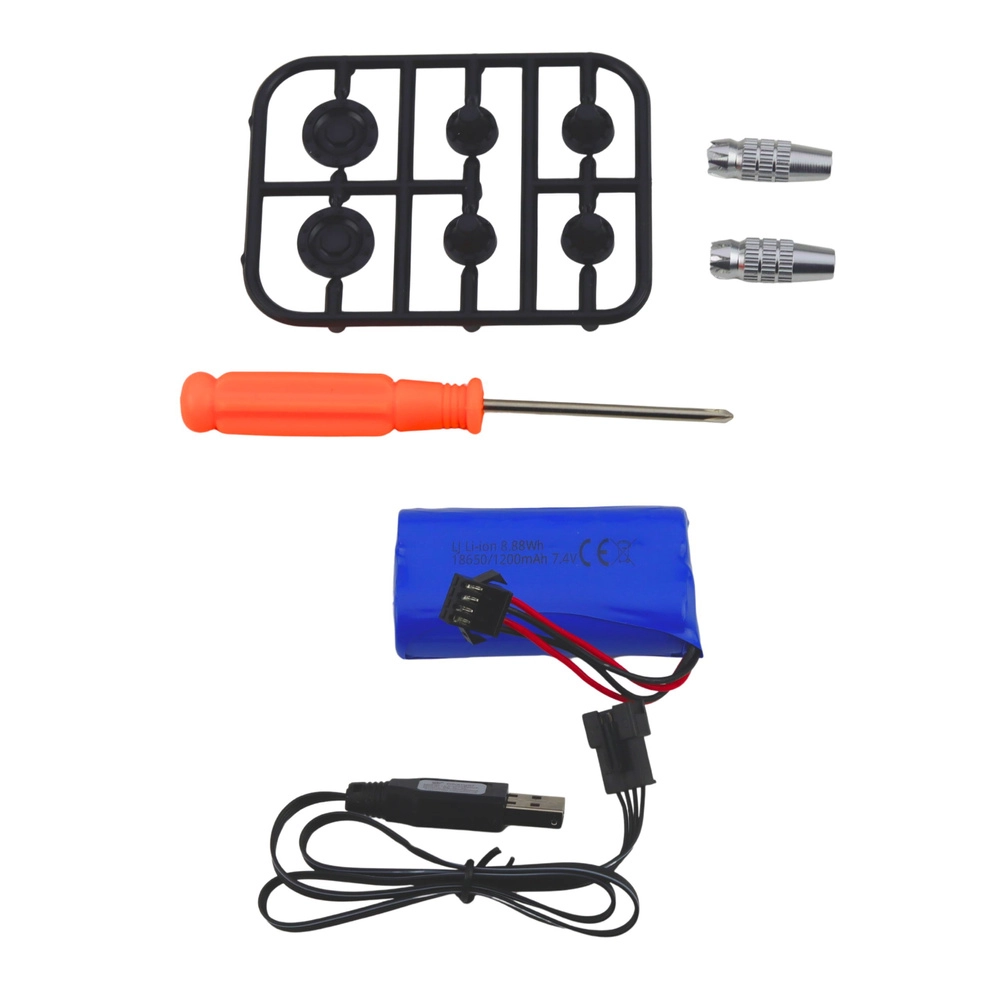 In de verpakking vind je een 7,4 V 1200 mAh-accu, een USB-oplaadkabel en accessoires – plaats alleen nog AA-batterijen in de controller en je kunt meteen rijden.