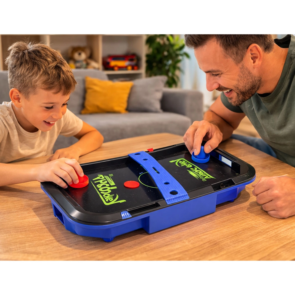 Ontdek de compacte tafel-airhockey die op elke tafel past en garant staat voor uren competitief plezier. Eenvoudige regels en een hoog tempo vermaken zowel kinderen als volwassenen, terwijl het luchtsysteem minimale wrijving en snel glijden van de puck garandeert.