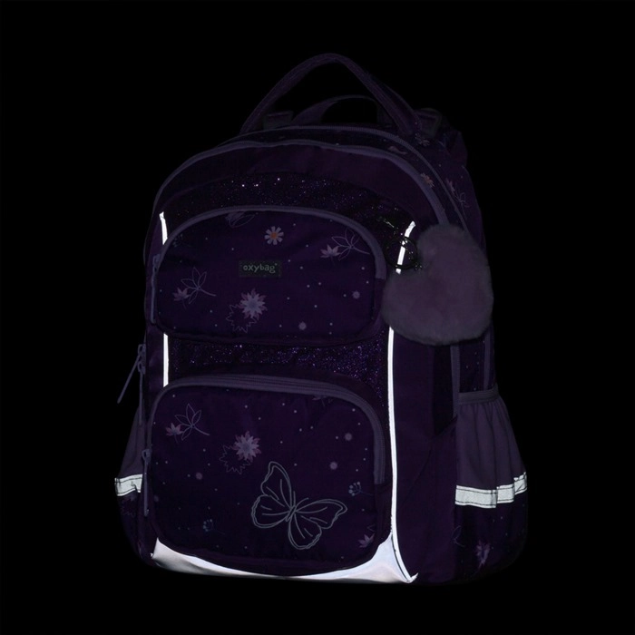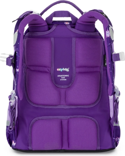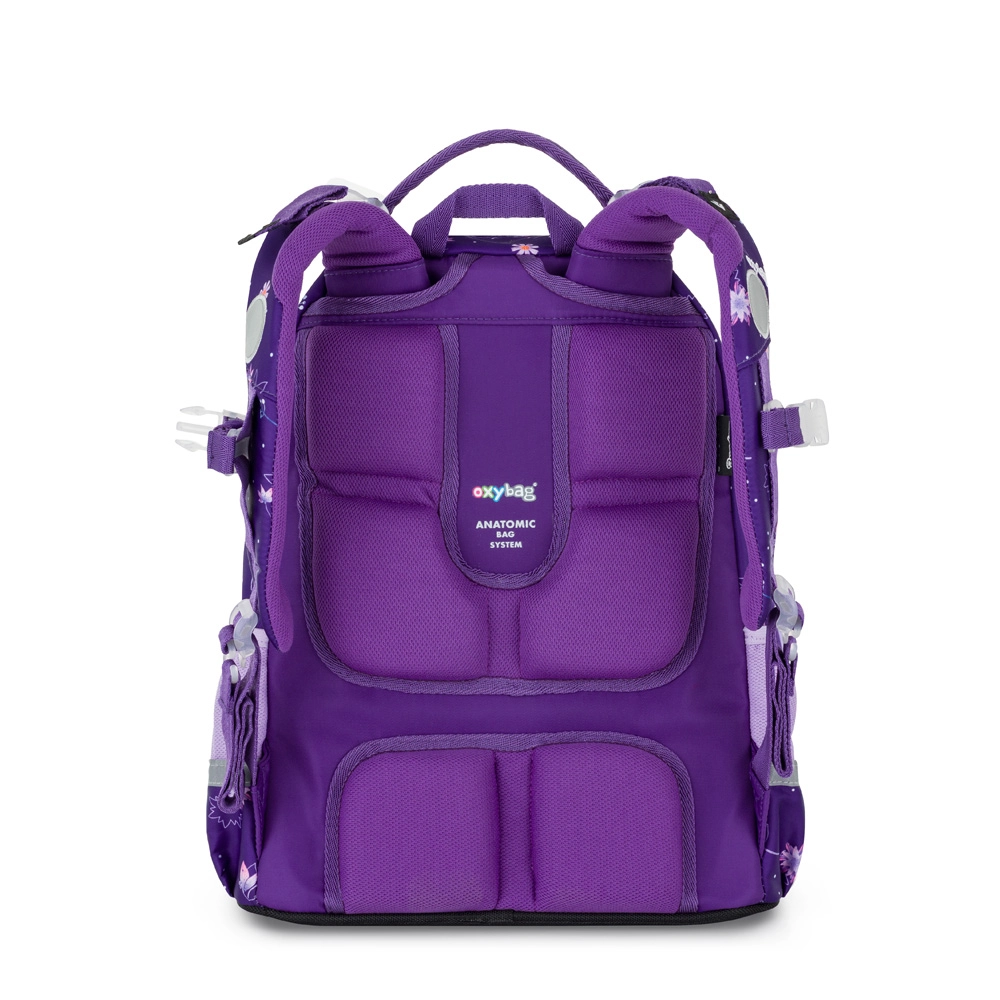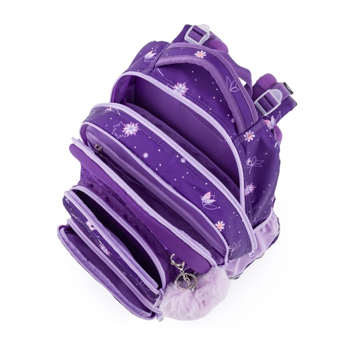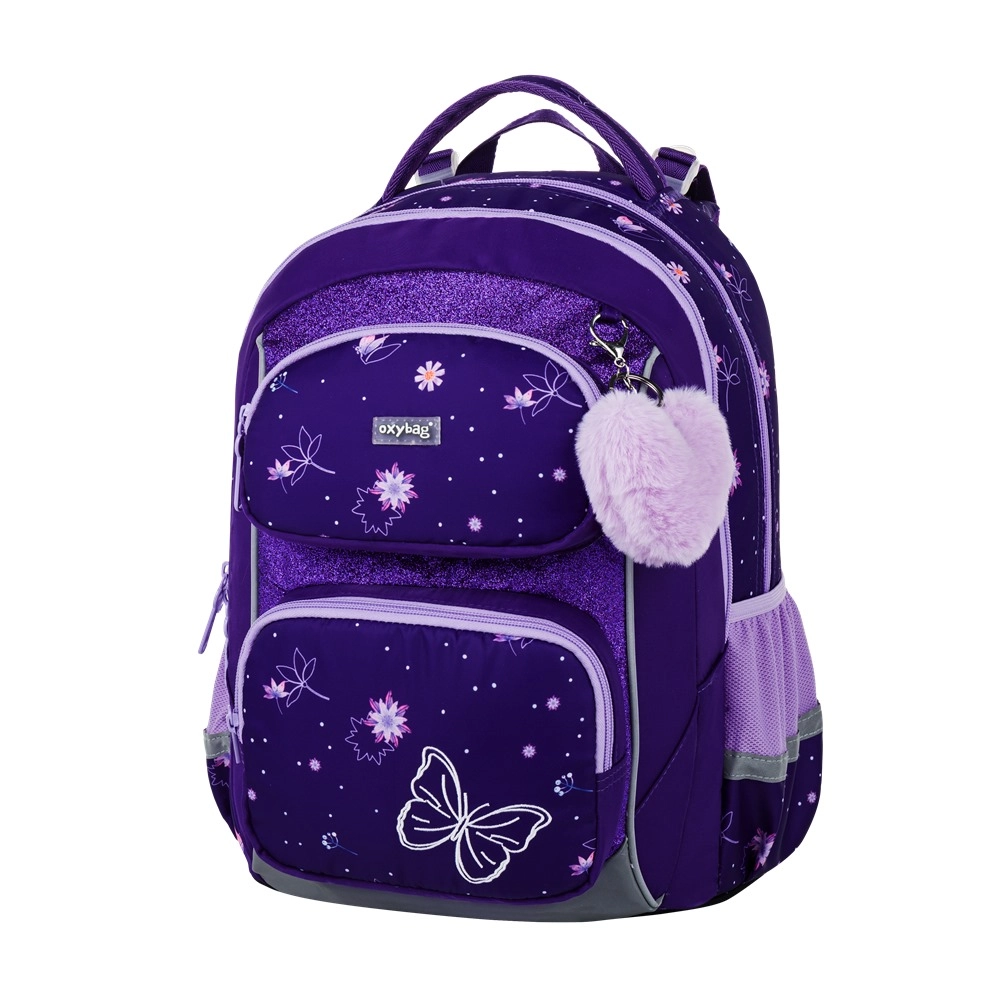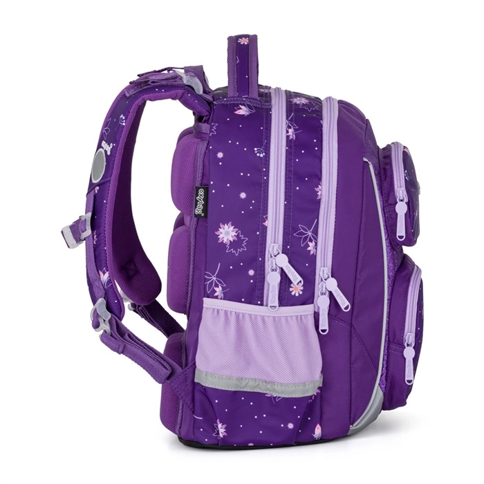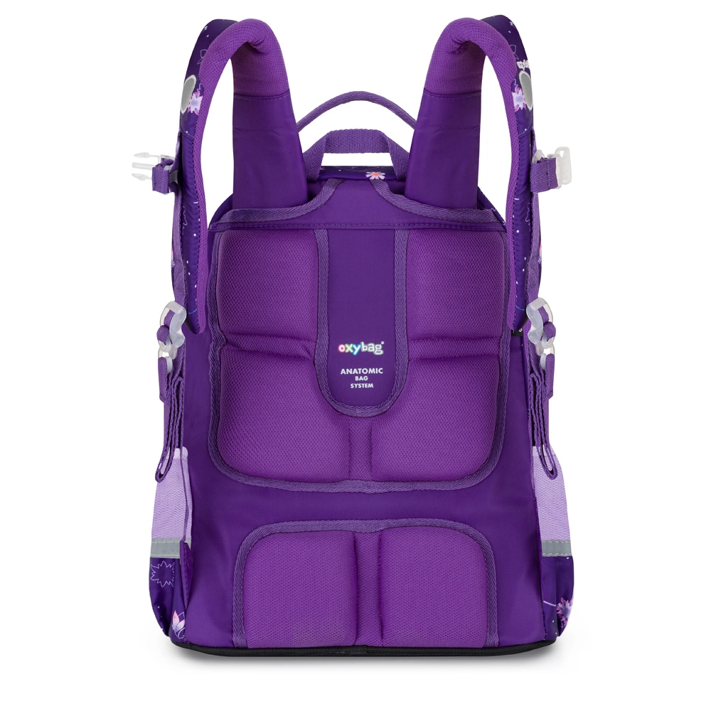 De schoolset OXY Jumper Flowers is ontworpen voor comfortabel dagelijks gebruik en overzichtelijke organisatie van schoolbenodigdheden. Twee ruime hoofdvakken bieden plaats aan boeken en schriften, het voorvak is ideaal voor een lunchbox en de zijvakken van mesh houden een fles altijd binnen handbereik. De anatomisch gevormde rugplaat en de verende schouderbanden met borstriem verdelen de last en verhogen het draagcomfort.