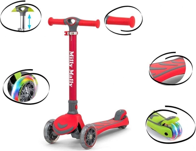 De lichte en duurzame kinderstep Milly Mally Boogie Scooter in een stijlvolle rode kleur maakt alle kleine coureurs blij. Hij heeft een aluminium constructie, 3 wielen voor stabiliteit (achter dubbel), voor- en achterwielen met verlichting van PU voor een stille en gripvaste rit, verstelbaar stuur in 3 niveaus en een rem op het achterspatbord. Geschikt vanaf 3 jaar, draagvermogen tot 50 kg.