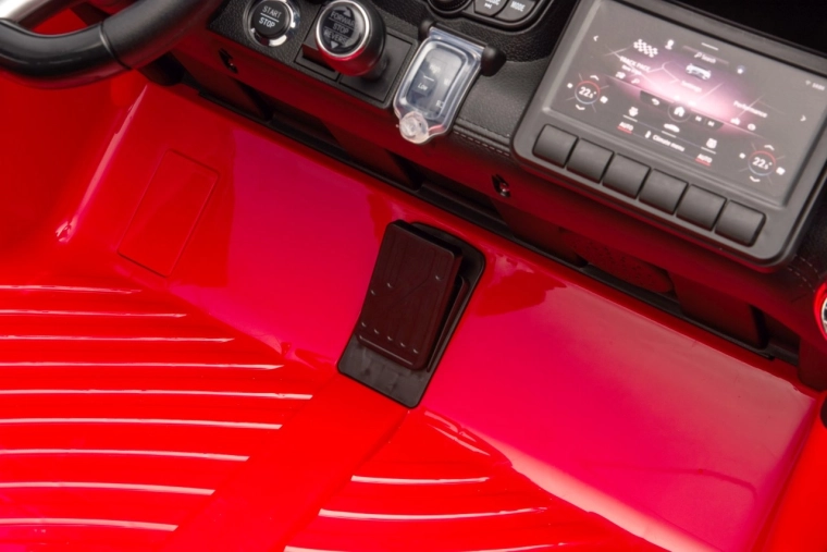 Veiligheid en controle worden verzekerd door de 2,4GHz afstandsbediening met 3 snelheden en een noodStop‑knop. Twee afzonderlijke stoelen van eco‑leer met veiligheidsgordels bieden comfort en zekerheid. De auto verrast ook met LED‑verlichting voor en achter, een werkende laadindicator en openslaande deuren voor eenvoudig instappen.