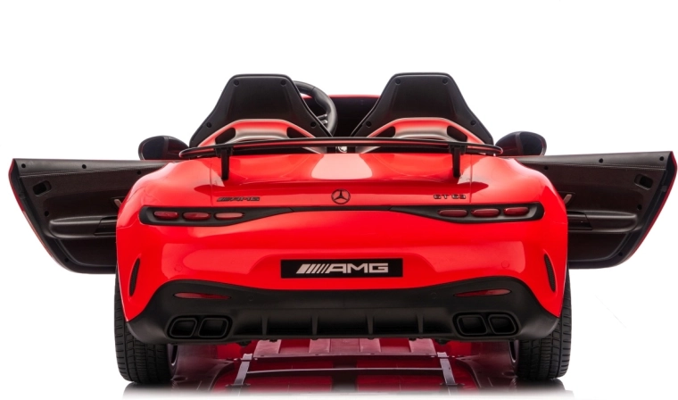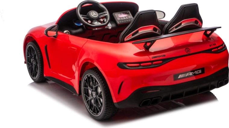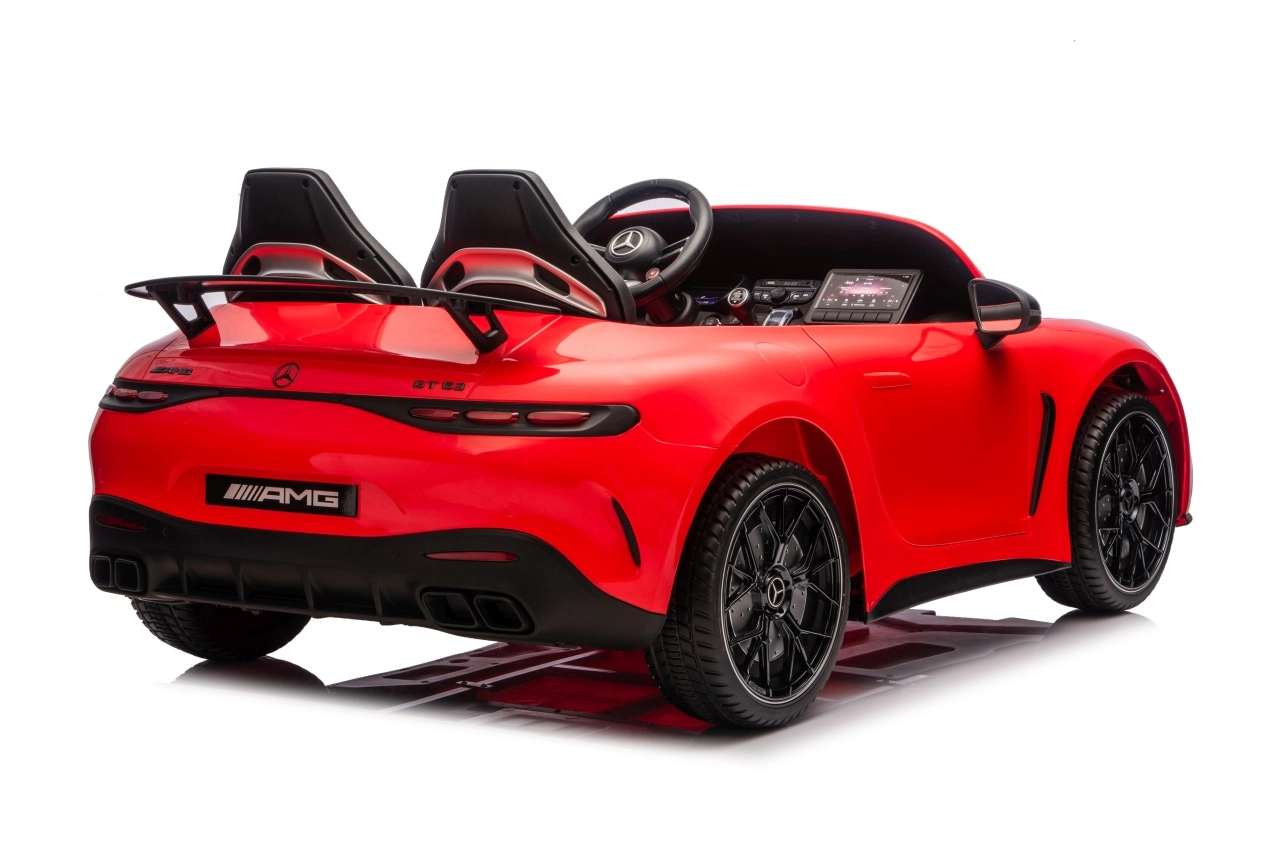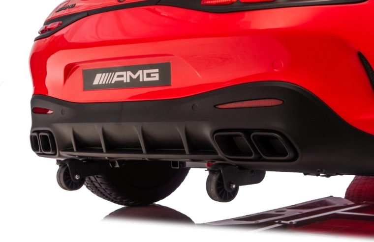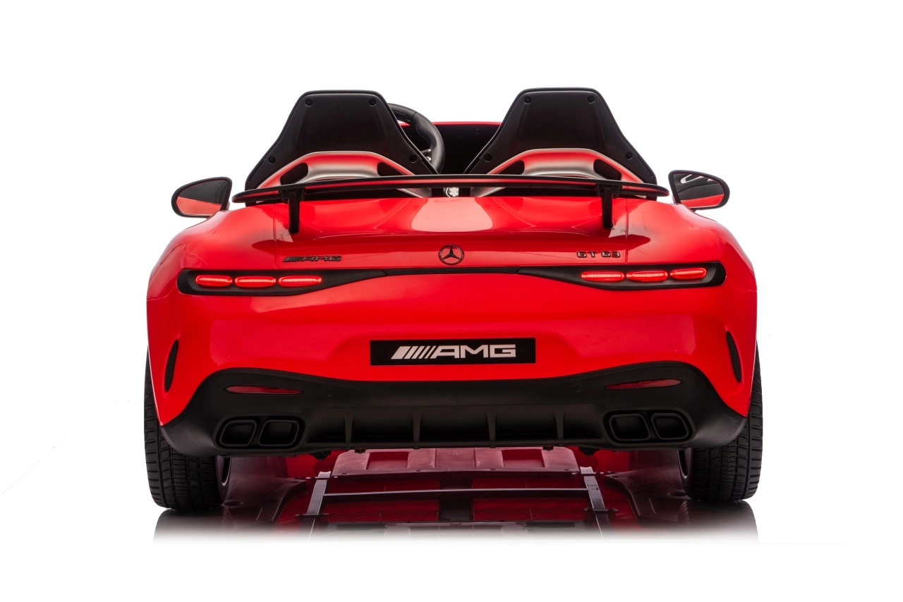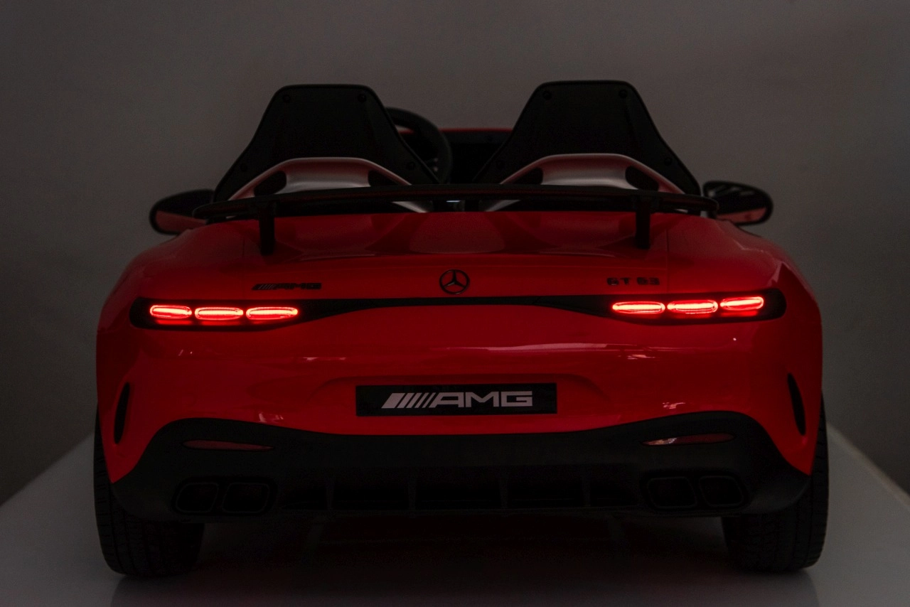 Vervul de kinderdroom van een sportwagen met het gelicenseerde uiterlijk van de MERCEDES‑AMG GT63. Dit robuuste model kan dankzij de vierwielaandrijving 4x200 W en de krachtige 24V accu zelfs met twee kinderen rijden. EVA‑schuimbanden van 27×9 cm zorgen voor een stille, comfortabele rit, de achterste schokdempers verhogen het comfort op oneffenheden en de vloeiende soft start garandeert wegrijden zonder schokken.