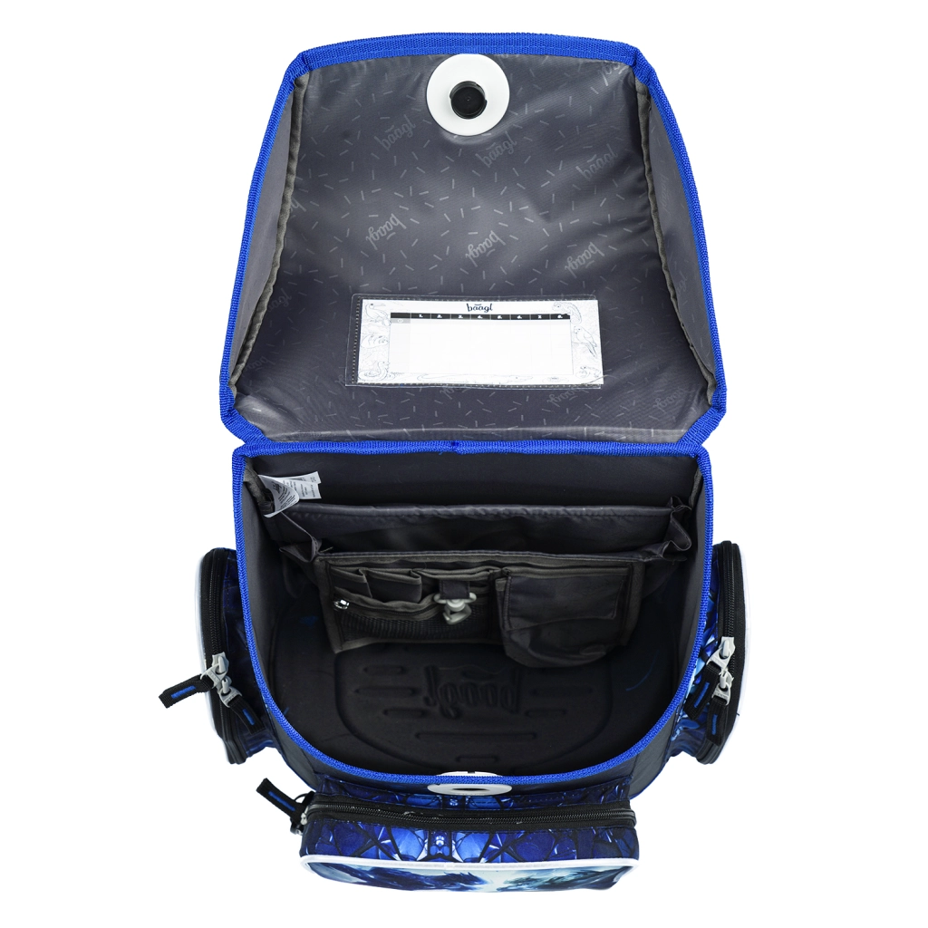 De praktische indeling binnenin met organizer, transparant vak voor het rooster, geïsoleerd voorvak en twee zijvakken houdt alles op orde. De set wordt aangevuld met een enkeldeks etui (zonder inhoud) met YKK-rits, een duurzame gymzak met trekkoord voor op de rug en een karabijn voor bevestiging aan de tas, een afneembaar kindershort met twee zakken en een nekportemonnee met naamlabel en veiligheidsclip aan het koord.