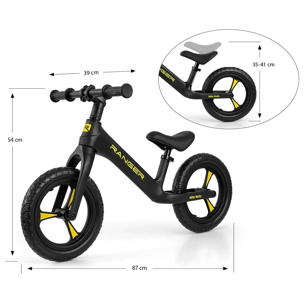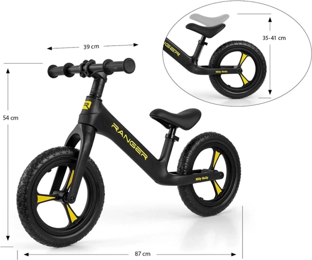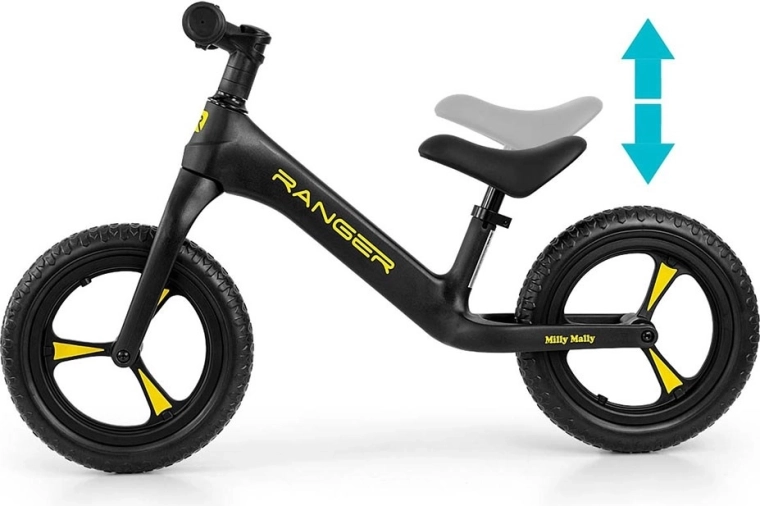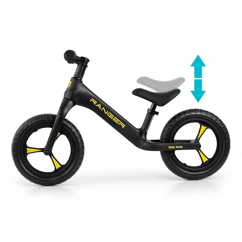 De loopfiets MILLY MALLY Ranger is een ideale keuze voor kinderen vanaf 2 jaar die hun evenwicht leren houden en zich voorbereiden op hun eerste fiets met pedalen. Het composietframe is stevig en uitzonderlijk licht, waardoor hij zowel voor kinderen als ouders gemakkelijk te dragen is. Het ergonomisch gevormde, zachte zadel groeit mee met het kind dankzij de eenvoudige hoogteverstelling.
