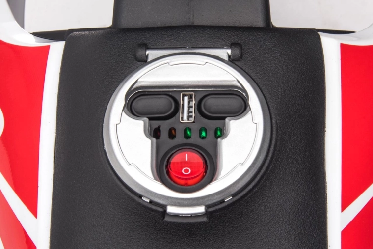 De motor is uitgerust met een modern audiopaneel met MP3, USB, Bluetooth en ingebouwde melodieën – favoriete muziek is onderweg altijd binnen handbereik. De krachtige 2x35 W aandrijving, gevoed door een 12 V 7 Ah accu, biedt voldoende vermogen, ook voor ritjes in de tuin. LED-koplampen verhogen de zichtbaarheid en geven een aantrekkelijk uiterlijk.