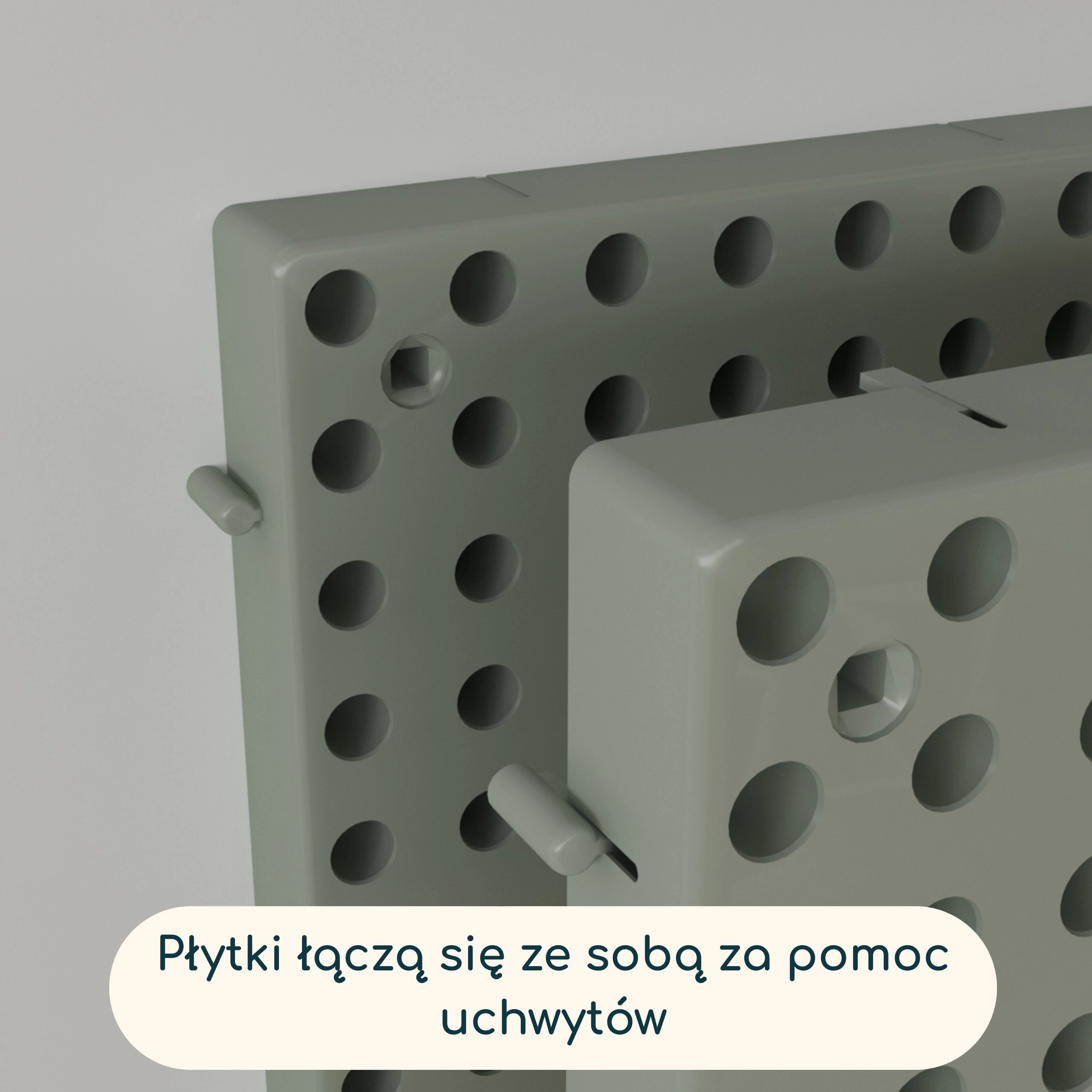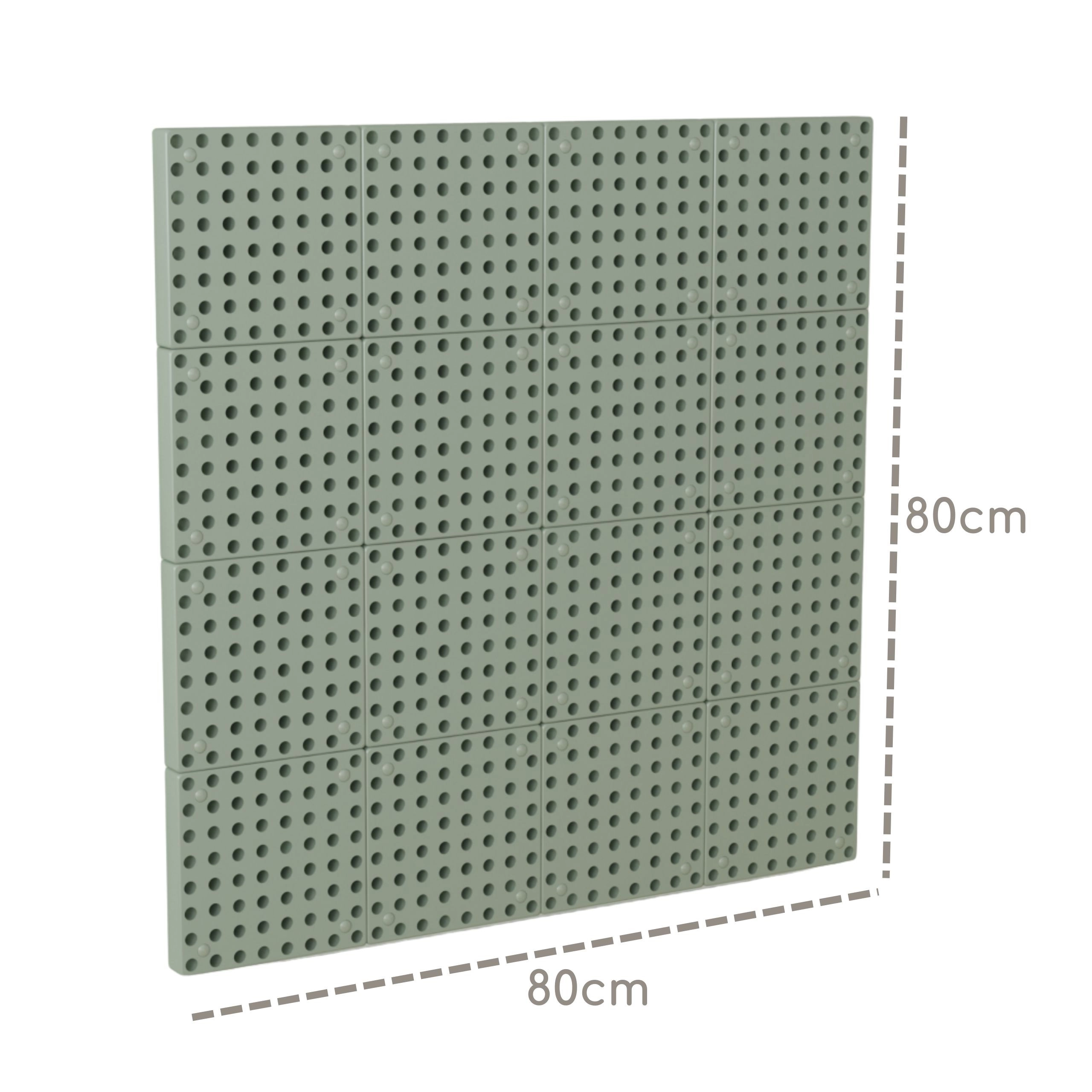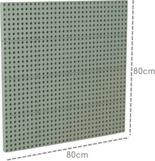 Vierkante panelen met een regelmatige rasterstructuur van gaten bieden een overzichtelijk oppervlak voor het organiseren van activiteiten, patronen en STEM-projecten.