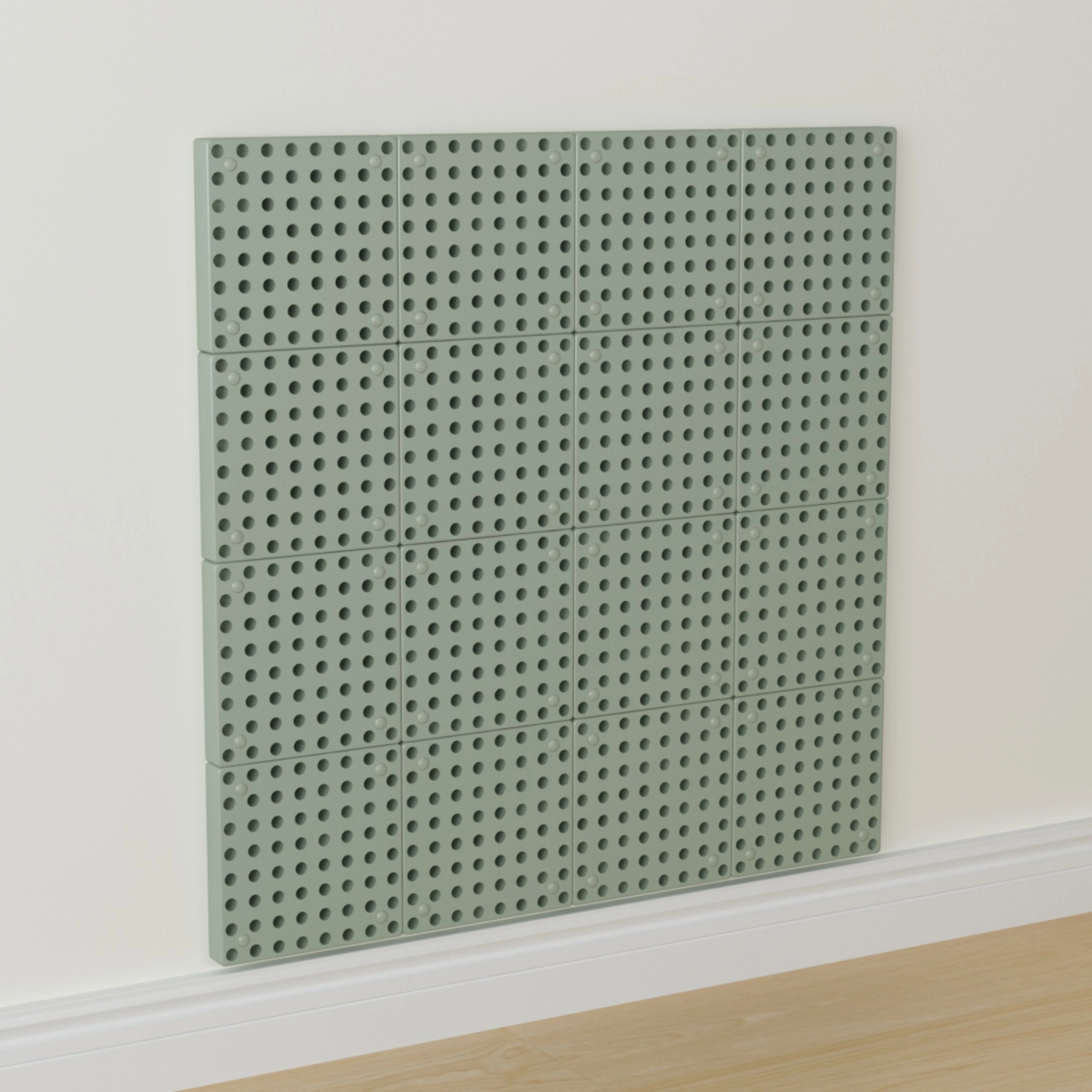 Matgroene geperforeerde panelen bedekken een groter stuk muur en dempen geluid, terwijl ze bestand zijn tegen dagelijks gebruik buiten en binnen.