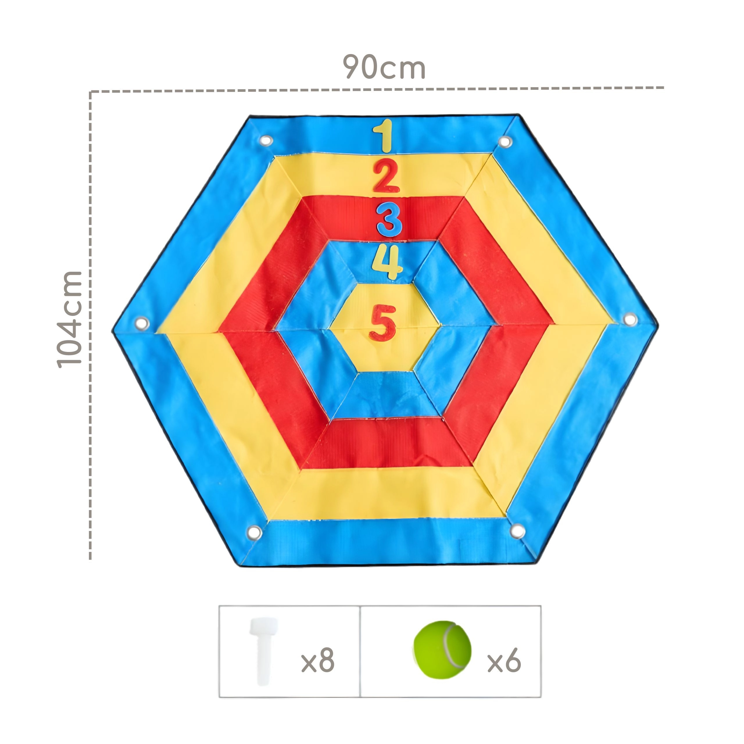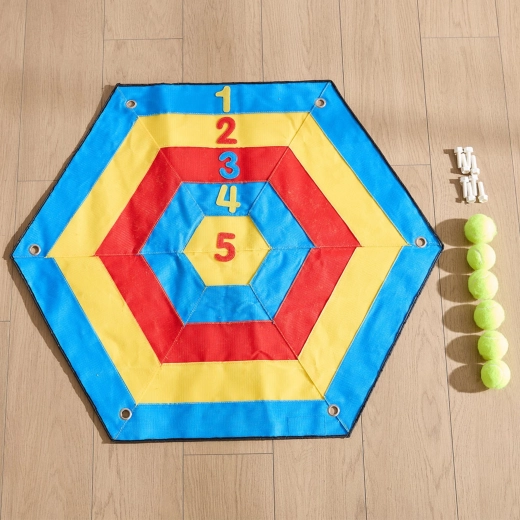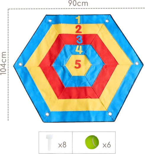Maak van rekenen een actief avontuur. De grote zeshoekige doelmat met ophangoogjes is ontworpen voor veilig en verslavend spel: kinderen gooien zachte klittenbandballen op de genummerde velden en verzamelen punten. De lichte constructie maakt snel ophangen aan muur of bord en gebruik buitenshuis mogelijk.