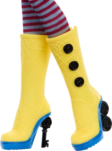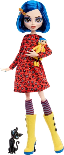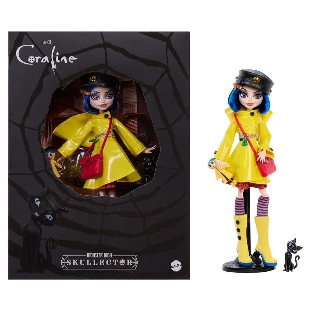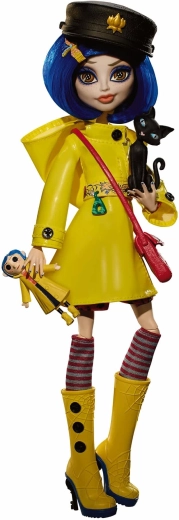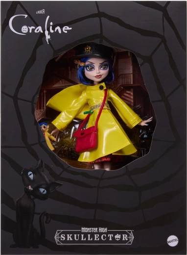 Ontdek de betovering van donkere fantasie met de CORALINE-pop in een unieke interpretatie van Monster High Skullector. De zorgvuldig uitgewerkte gele regenjas met knopen, gestreepte sokken en gele hoge laarzen met spinnendetails verwijzen trouw naar het filmvoorbeeld. De set bevat ook een mini Coraline-pop met knopenogen, een stijlvolle handtas, hoed en een figuurtje van de zwarte kat.